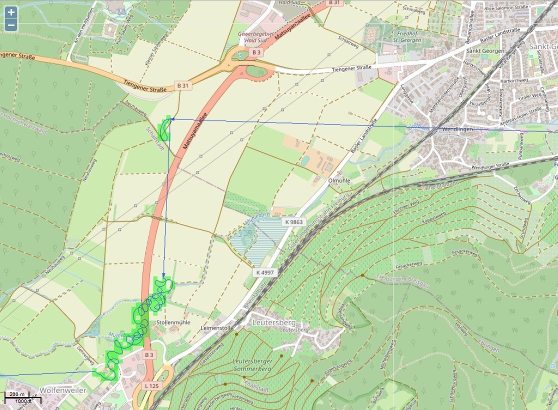 Es werden in der Karte dann auch die Flugschleifen angezeigt, die die Störche während eines Thermikfluges fliegen.
