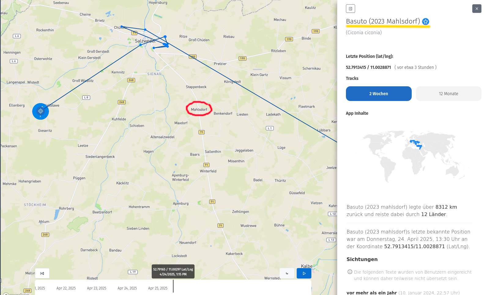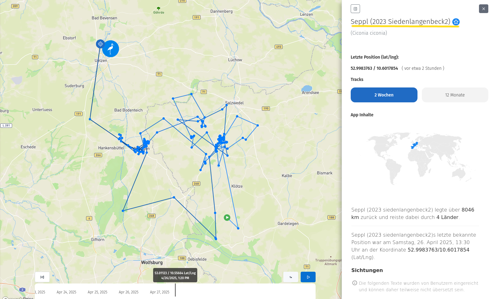 Aktuell scheint er die nordwestliche Altmark zu erkunden und er macht auch kurze Abstecher nach Niedersachsen.