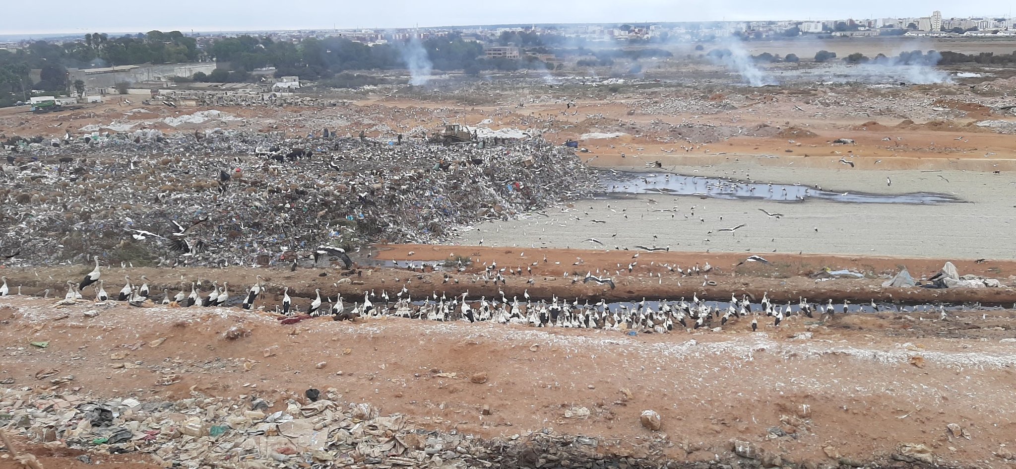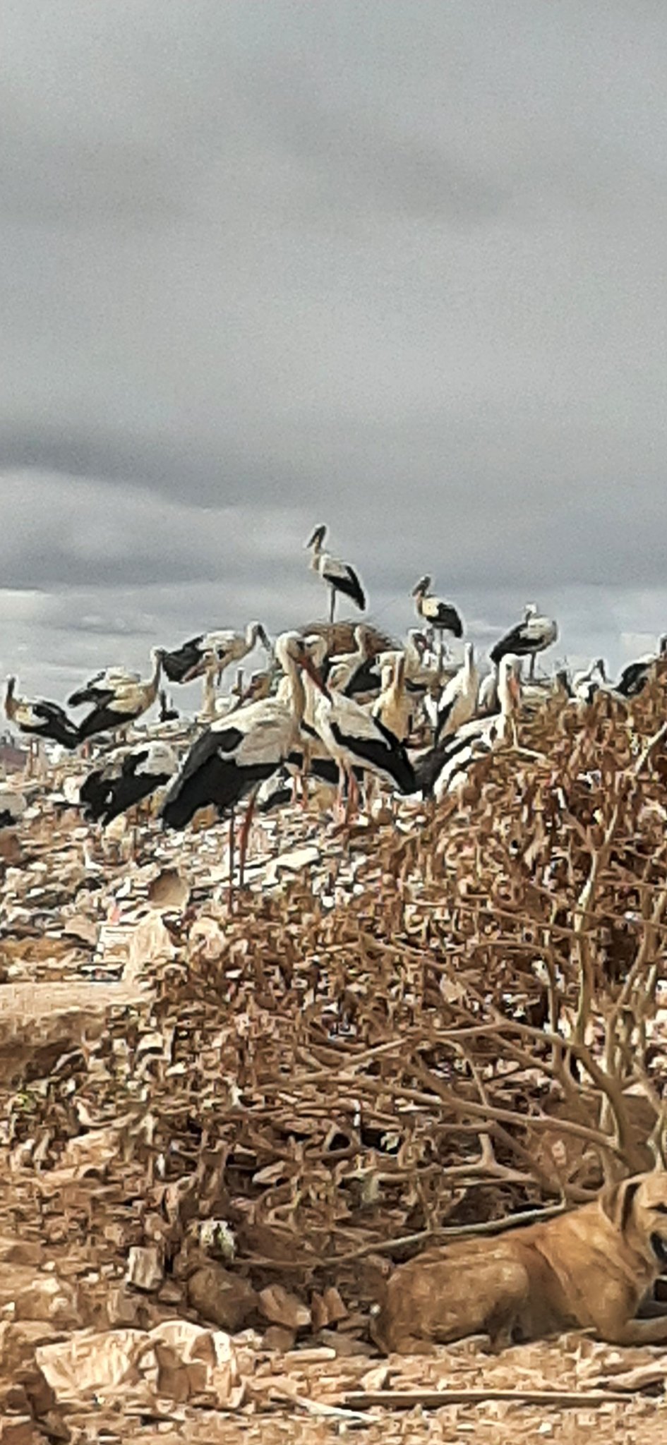 Als ich morgens um 7.00 Uhr in Kenitra ankomme, herrscht noch Dämmerung. Die Störche scheinen die Stadt geradezu zu bewachen. Es gibt Straßenzüge, in denen auf jeder Straßenlaterne ein Storch sitzt. Auf den Minaretten von Moscheen, Bäumen, Dächern gleich mehrere, überall Störche, nicht zählbar. Eine Stunde später kehrt auf einmal Leben in die Stadt ein. Nach und nach erheben sich die Störche in die Lüfte. Über das Ziel sind sie sich einig, sie fliegen allesamt in eine Richtung. Abidi Mustapha und ich folgen ihnen. Wir erreichen eine Deponie, auf der schon Fahrzeuge den Müll hin und herschieben. Der Gestank ist schon von Weitem zu riechen. Die Anlage ist bewacht, ein Zutritt nur mit Genehmigung erlaubt. Tausende Störche finden sich hier ein. Jeder wartet auf seine Chance, auf einen guten Happen. Ein Treiben, das unter die Haut geht. Und das ist die Chance auch für uns, nach Ringen und GPS-Sendern Ausschau zu halten. Teilweise wandern wir über das Gelände, teilweise fahren wir mit Pkw um die Müllansammlungen herum. In einem Pkw kann man besser verweilen, ohne dass sich die Störche gestört fühlen und hat genug Zeit, die Ablesearbeit vorzunehmen oder auch ein hilfsbedürftiges Tier zu entdecken. Und dann plötzlich ist ein GPS- Gerät auf dem Rücken eines Storches erkennbar. Was für eine Freude. Das ist OLE! Und dort ein Storch mit einem Ring aus Deutschland, einer aus der Schweiz und einer aus Belgien sowie den Niederlande. Die Nummern werden notiert, ein Foto gemacht.