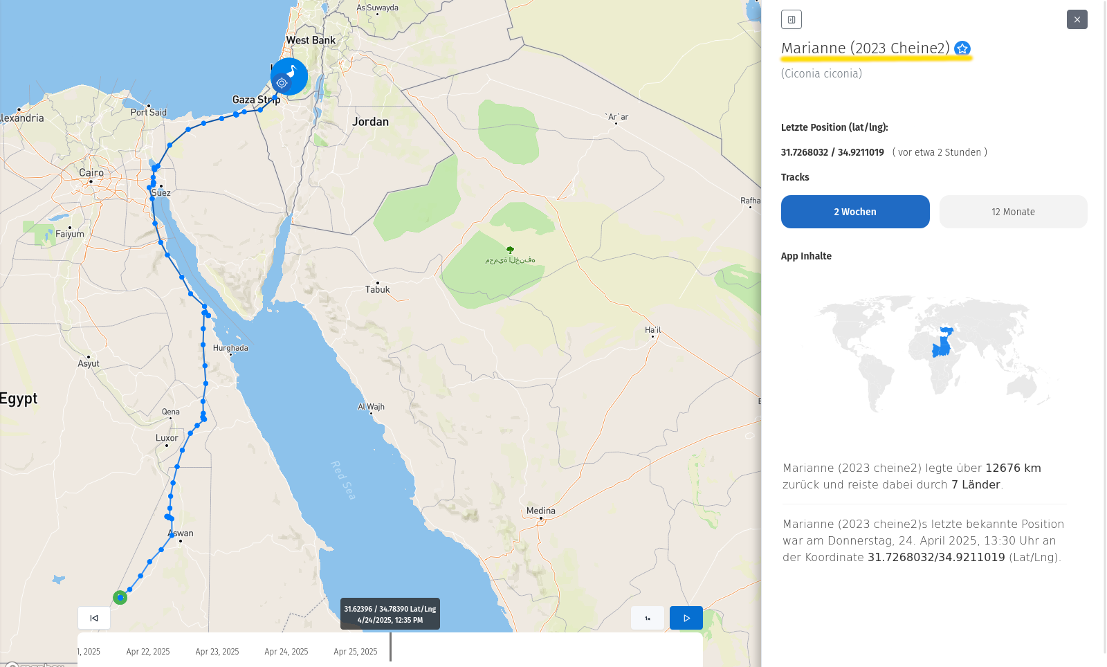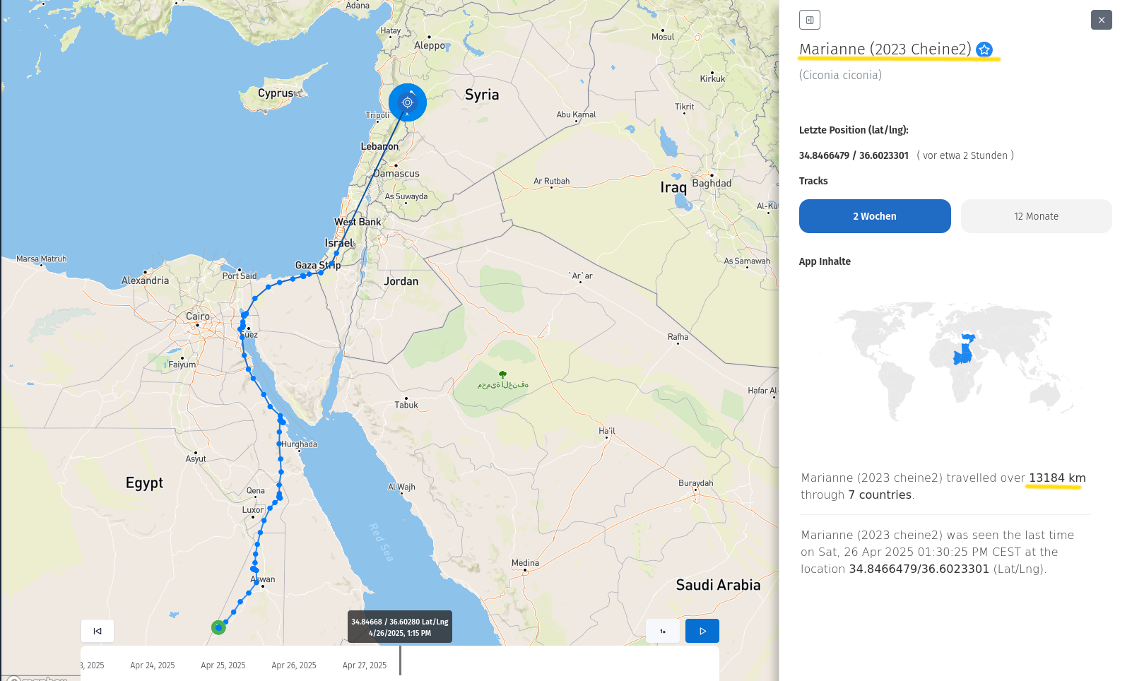 Ich beginne mit Marianne. Sie ist eine Ostzieherin und hat heute Syrien erreicht. Der Scan zeigt wunderbar, wie ihre Route in den letzten Tagen verlaufen ist; nachdem sie eine ganze Weile in Ägypten verweilt hatte.
