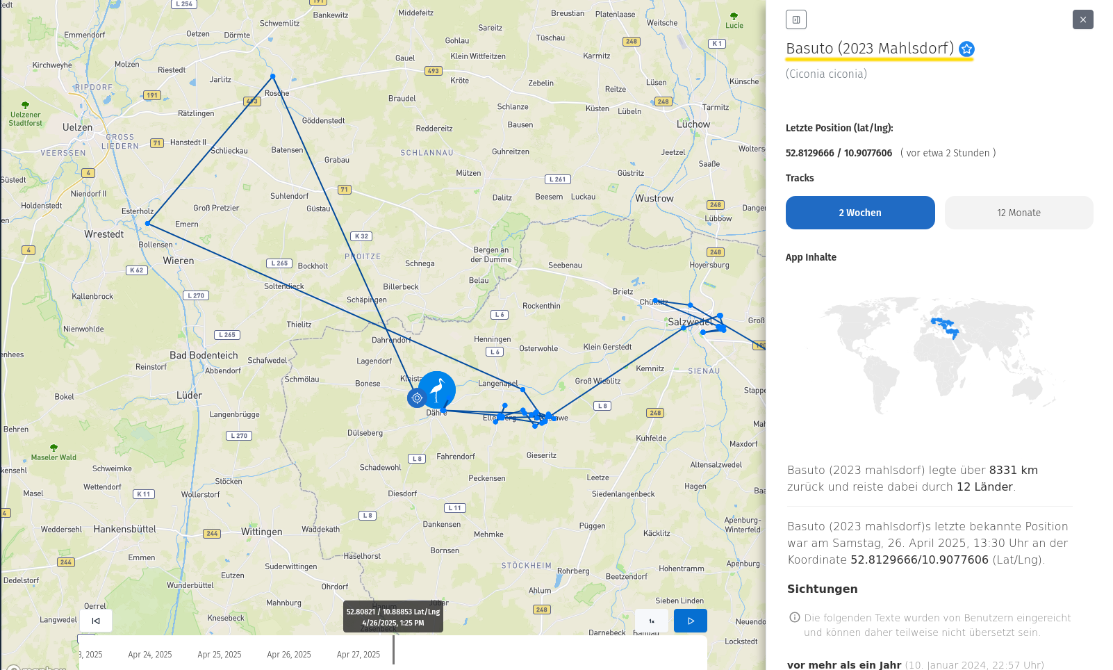 Aktuell scheint er die nordwestliche Altmark zu erkunden und er macht auch kurze Abstecher nach Niedersachsen.