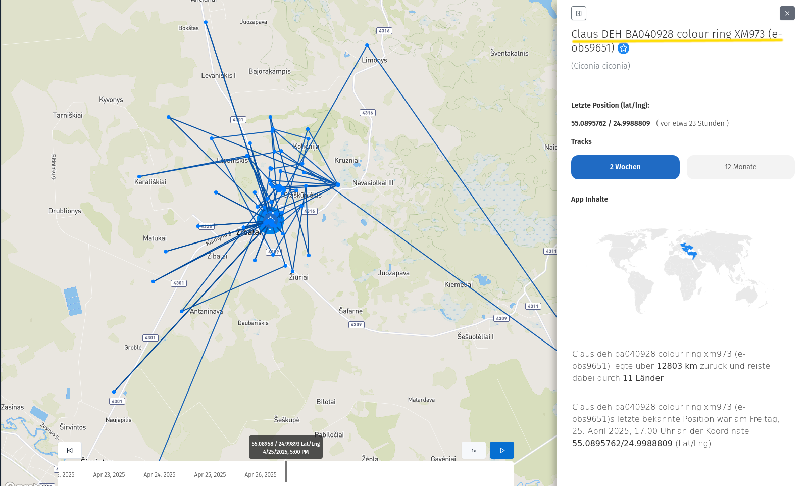 Er war/ist ja ebenfalls ein Ostzieher und hat in Israel überwintert. Nach seiner spektakulären 'Meer-Überquerung', wo er den Süd-West-Zipfel des Schwarzen Meeres im Ruderflug innerhalb von 7 Stunden (350 Kilometer-Strecke) überwand, vagabundierte er noch eine Weile herum, um schließlich im Baltikum, genau: in Litauen, nun offenbar eine neue Heimat gefunden zu haben. Zumindest ich interpretiere den Scan so, denn er zeigt, dass sich Claus seit vielen Tagen innerhalb eines Gebietes länger und intensiver aufhält. Aktuell ist er in der Nähe der Stadt Zibalai, die sich rund 120 Kilometer nordwestlich von Vilnius befindet.