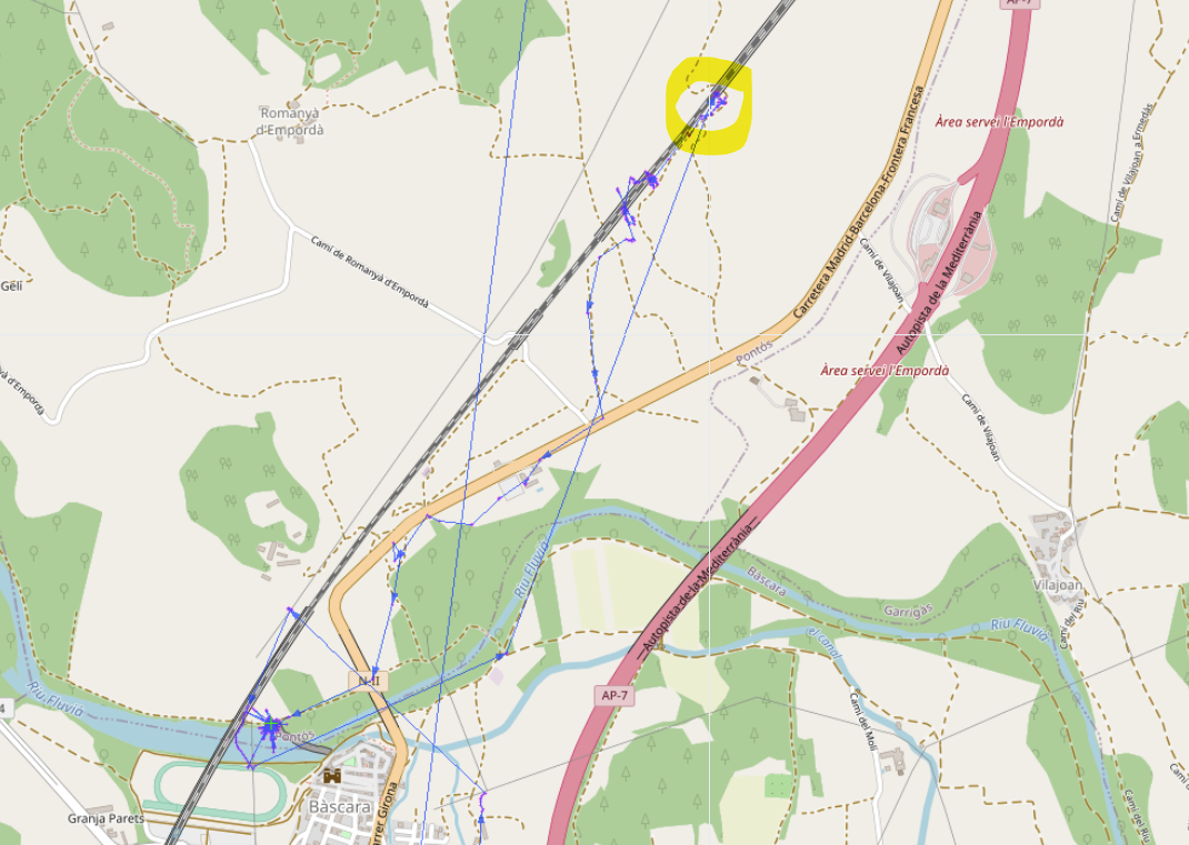 Movebank-Ansicht des möglichen Unglücksortes von Britta an einer Bahntrasse nördl. von Bascara.
