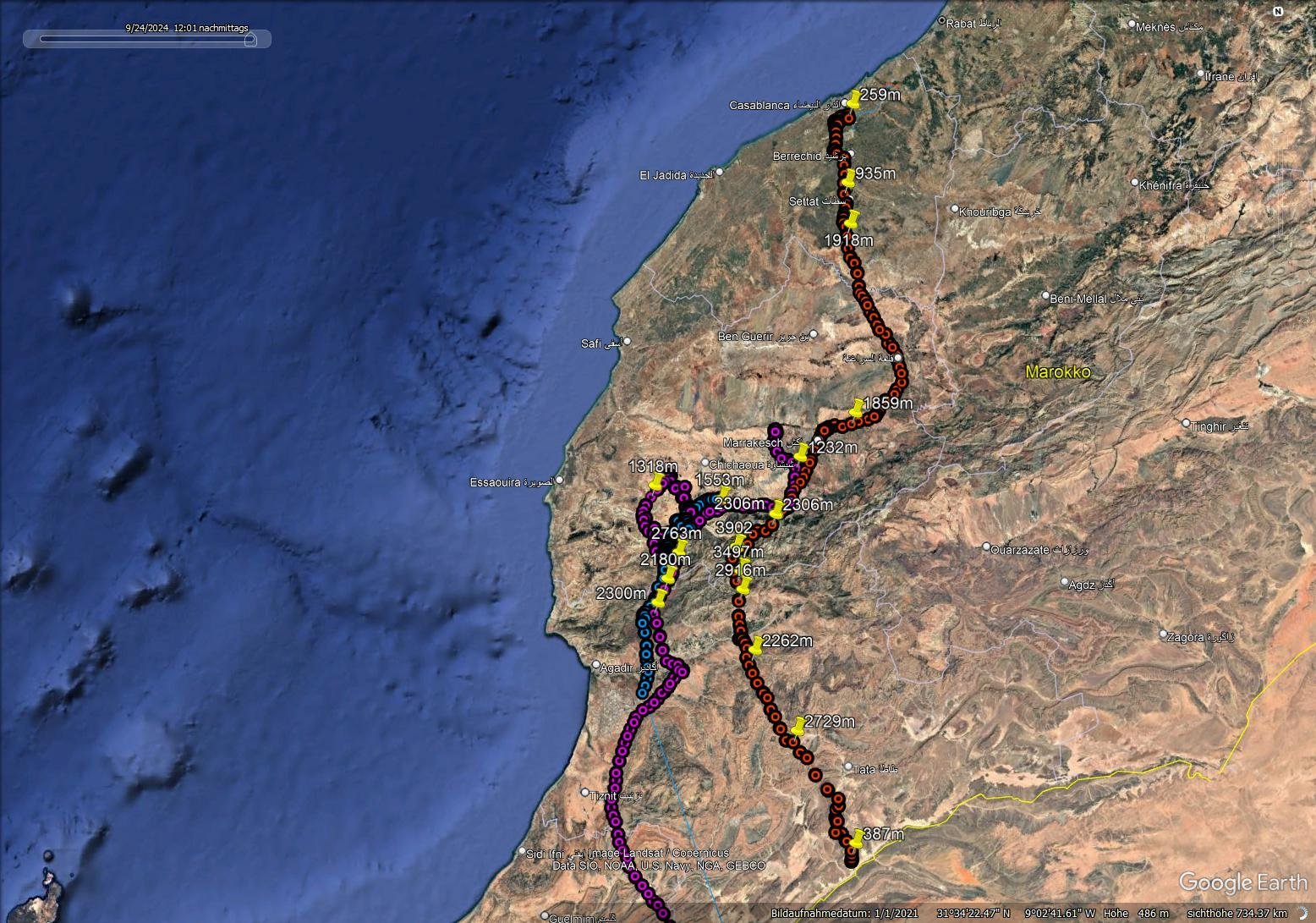 Holger hat am 12. Sept. 2024 den Hohen Atlas zwischen 13:30 Uhr und ca. 15:30 Uhr überquert.