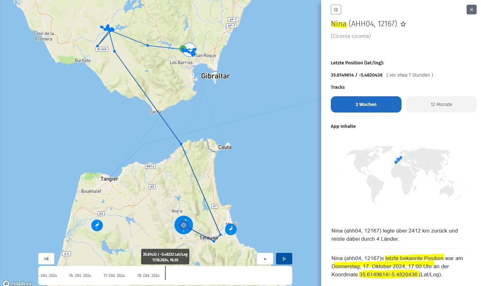 Nina verbrachte - wie Maxi es tat und das teilweise zusammen mit ihr - seit dem 11. Sept. 2024 mehrere Wochen im Süden Spaniens auf der Deponie von Los Barrios und auf den Ländereien der dortigen Gutshöfe ... doch heute Mittag entschied sich der Storch überraschend dazu, die Meerenge von Gibraltar zu überfliegen.