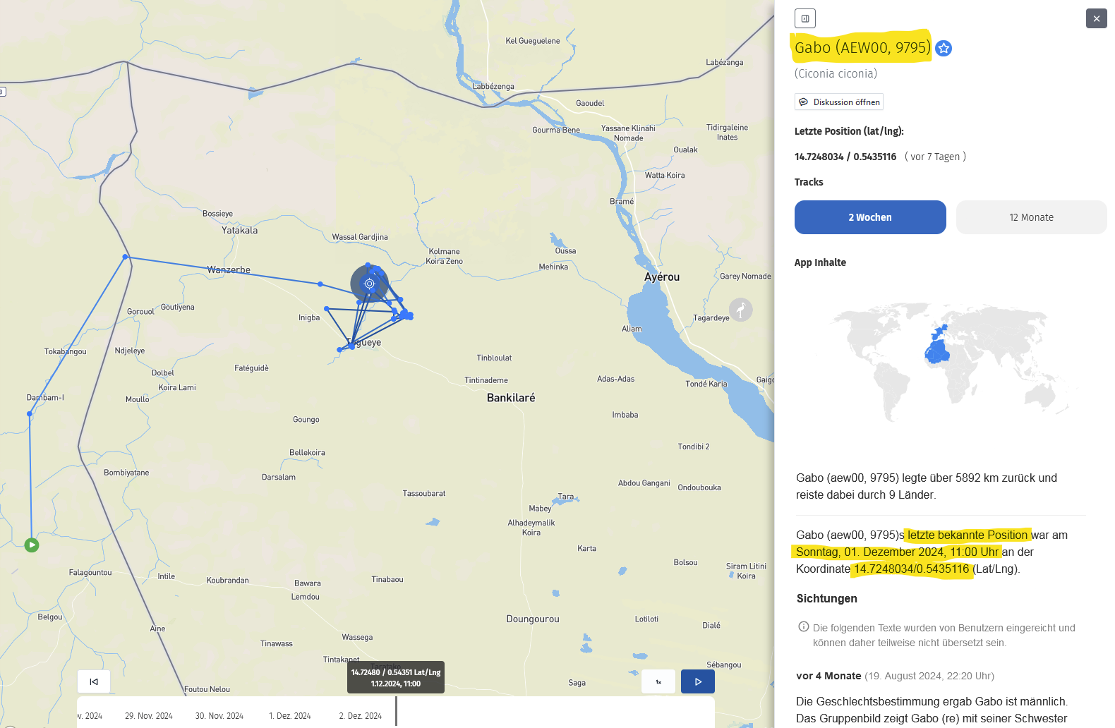 Laut seiner Senderdaten befindet er sich seit dem 17. November im Niger nahe den Grenzen zu Burkina Faso und Mali.
