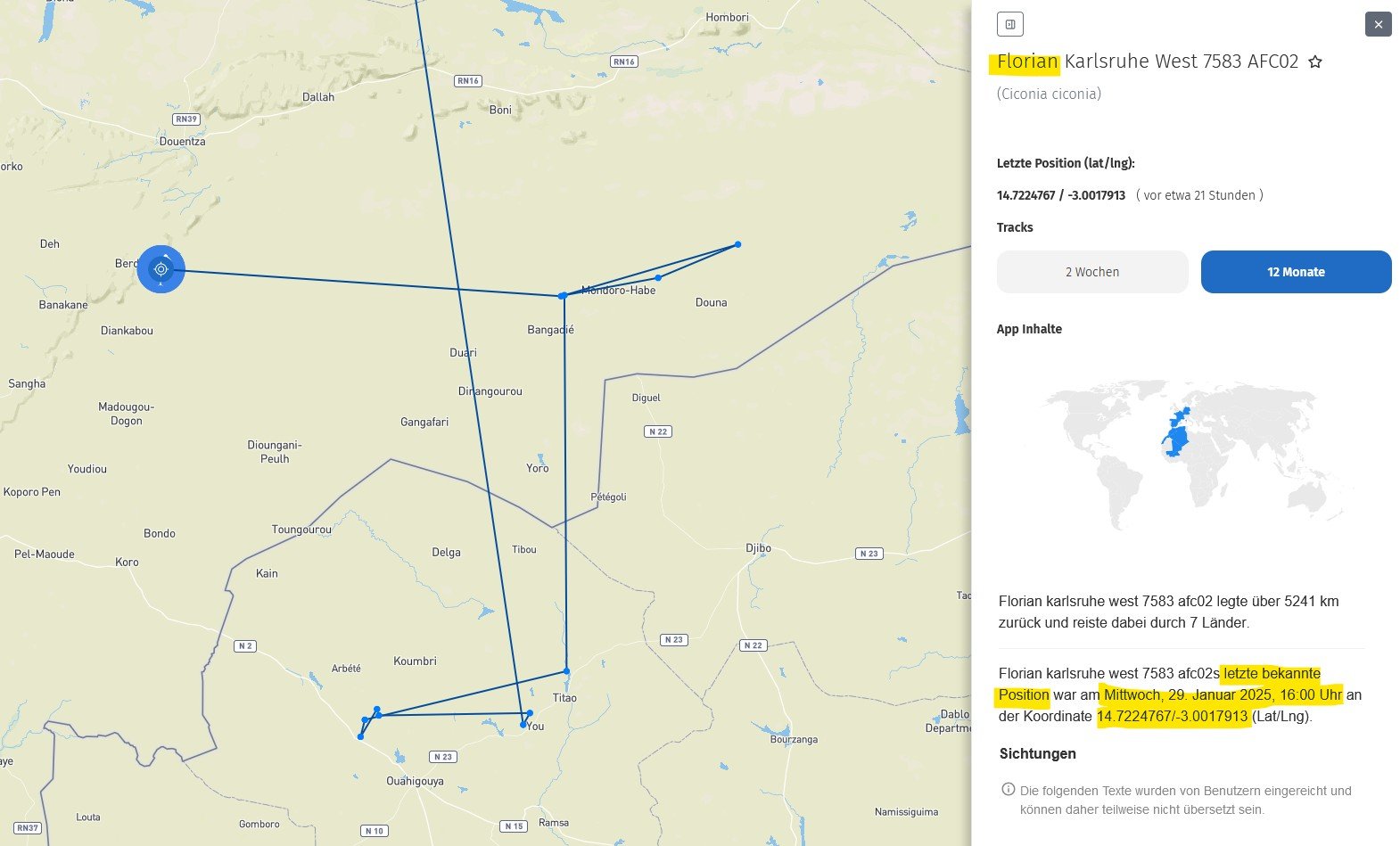 nach 2,5 Monaten Funkstille, in Mali geortet. Am 14. Nov. 2024 hatte ihr Sender zuletzt aus Burkina Faso gesendet.