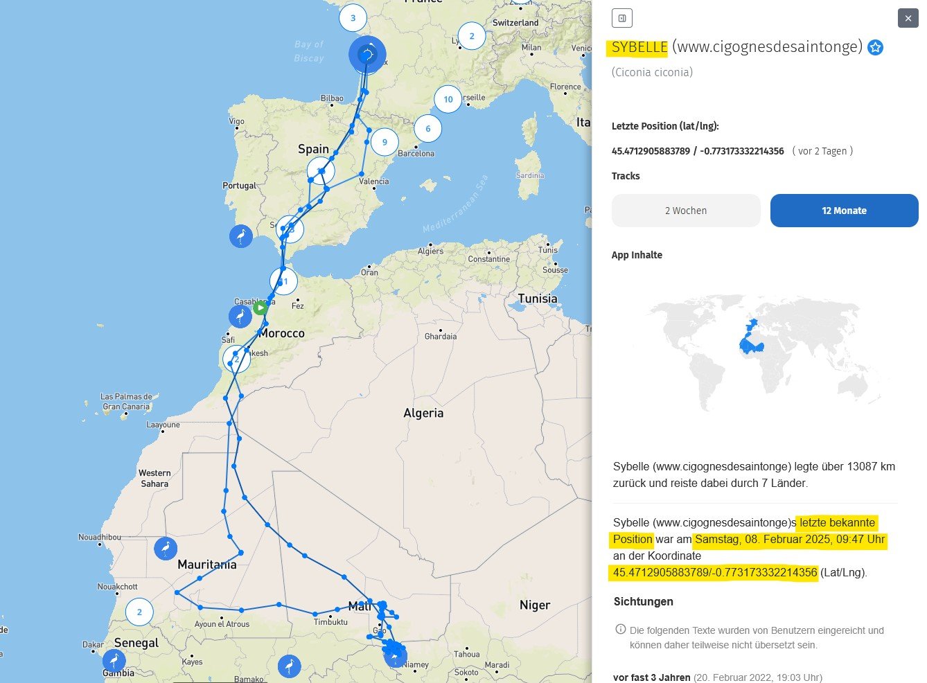 Mathias hat geschrieben: Mo 10. Feb 2025, 11:06Liebe Elisa, natürlich ist Sybelle schon länger wieder Zuhause, das ist auch an mir nicht vorbeigegangen... Ich meinte oben, von 'meinen' Störchen, die alle das Zielland Deutschland haben, ist Anka die erste gewesen.