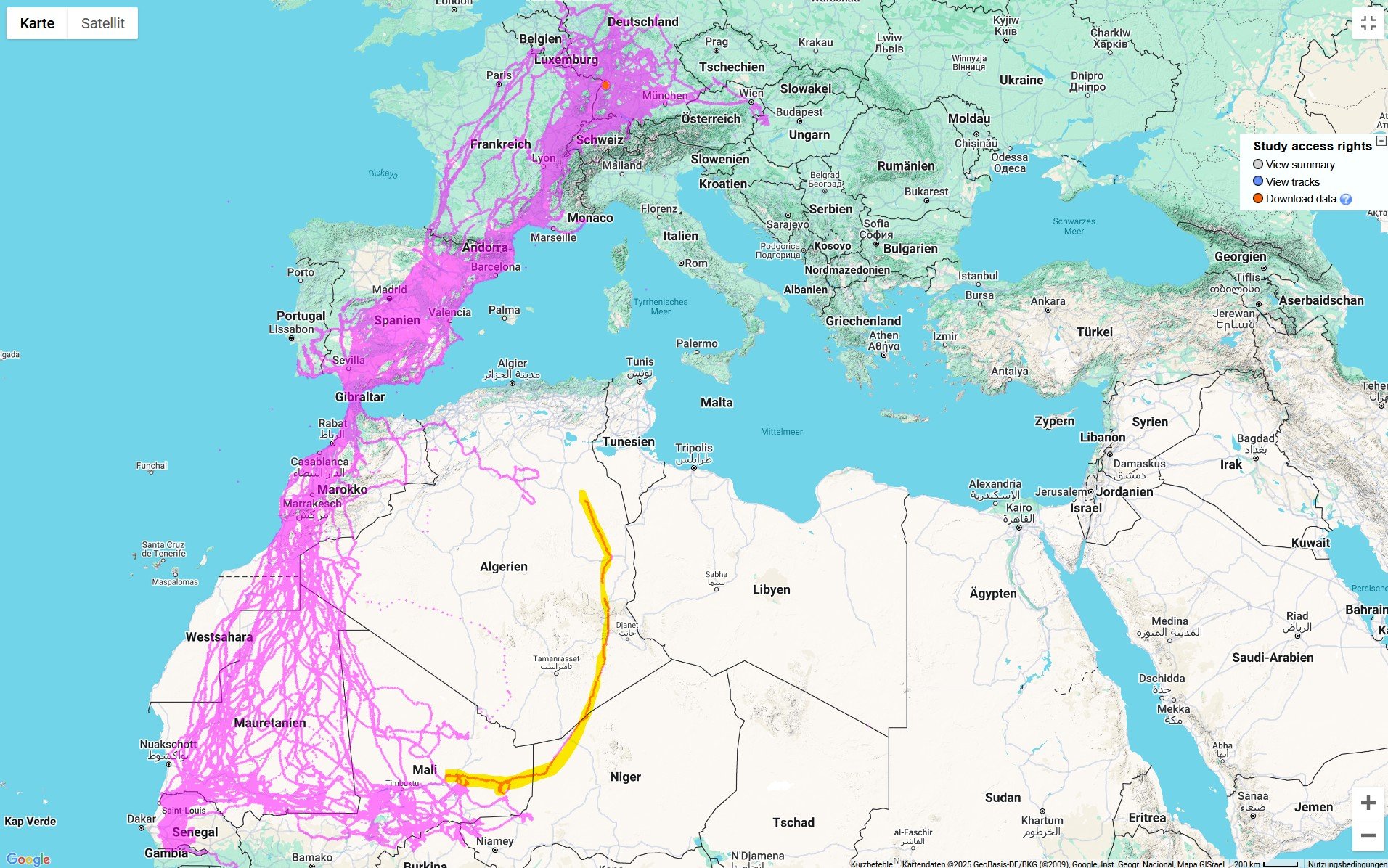 - Gabos Route mitten durch den ostalgerischen Teil der Sahara ist ungewöhnlich, wenn man die Routen der Vergleichsgruppe betrachtet.