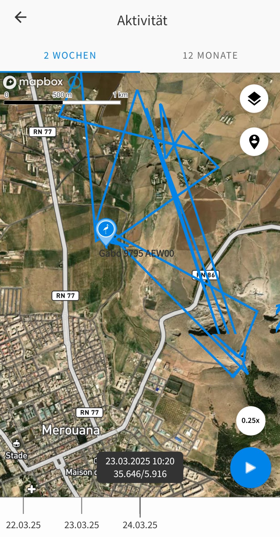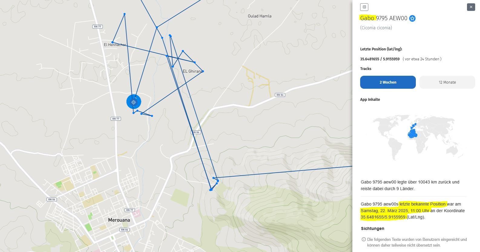 Nina hielt sich längere Zeit nördlich von Tetouan im Norden Marokkos auf. Er startete bereits am 19. März 2025 den Überflug. Um 11:45 war das letzte Tracking direkt an der Küste. Der nächste Trackingpunkt - genau eine Stunde später, um 12:45 - war dann bereits über Spanien.