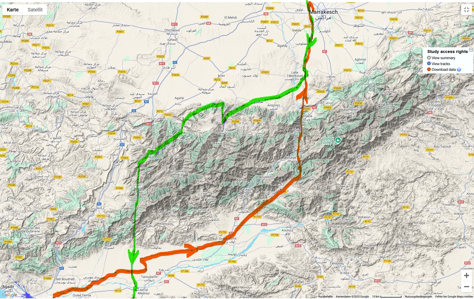 - Frankie war auf dem Rückweg etwas mutiger: Er flog auf dem Rückweg einen direkteren Weg über den Hohen Atlas.