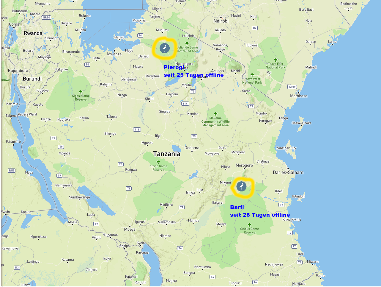 Bei Muffin, Barfi und auch Pierogi hoffe ich allerdings, dass sie sich lediglich in Gegenden aufhalten, wo die Funkverbindung nicht aktiv ist. Bei anderen Störchen, die in den ähnlichen afrikanischen Regionen unterwegs waren, gab es immer auch mal Verbindungsunterbrechungen.