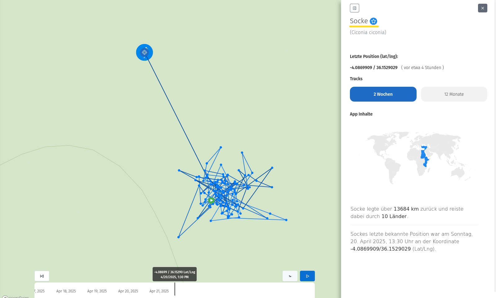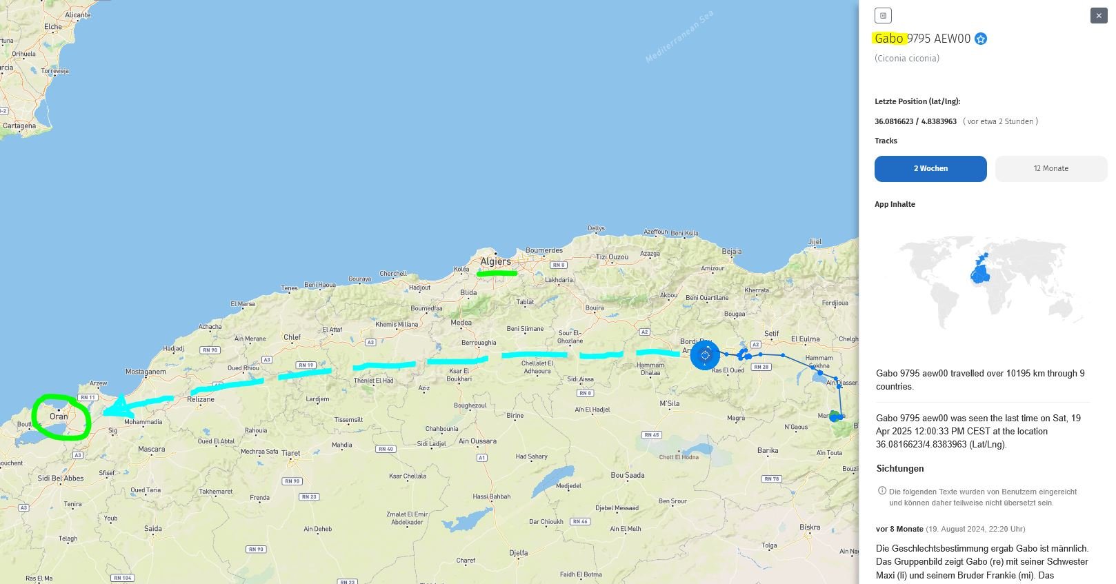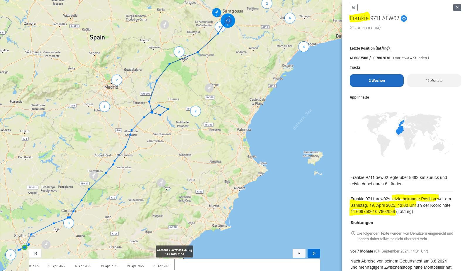 Das Problem ist zum Einen, dass ihr Sender nur ein Mal täglich sendet, und zum anderen, dass die Position erst abends um 20 Uhr gesendet wird, zu einem Zeitpunkt, wo Störche im Normalfall ihren Schlafplatz aufsuchen.
