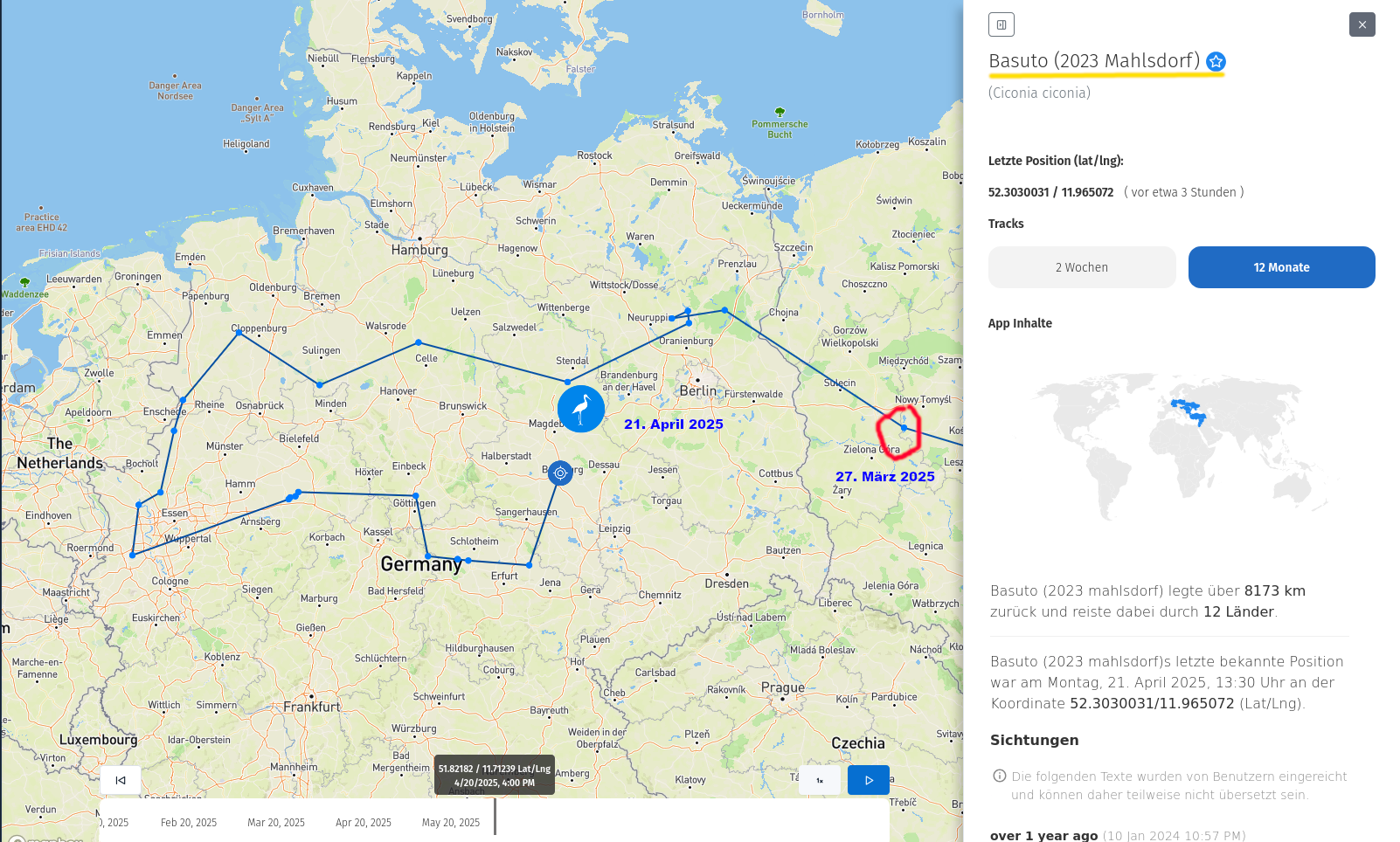 Hier ist die Strecke, die er seit dem 27. März (noch in Polen) bis heute (21. April) geflogen ist. Quelle: https://www.animaltracker.app