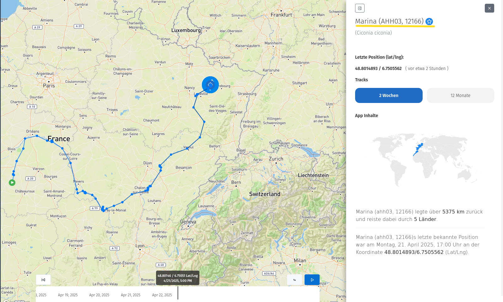 Dass sich die Entfernungskilometer nachträglich reduzieren, hat nichts mit den Bewegungen eines Storchs zu tun!Mathias hat geschrieben: So 20. Apr 2025, 17:532) Warum zählt der Streckenzähler rückwärts, wenn der Vogel doch seinen Ort nicht mehr verändert?