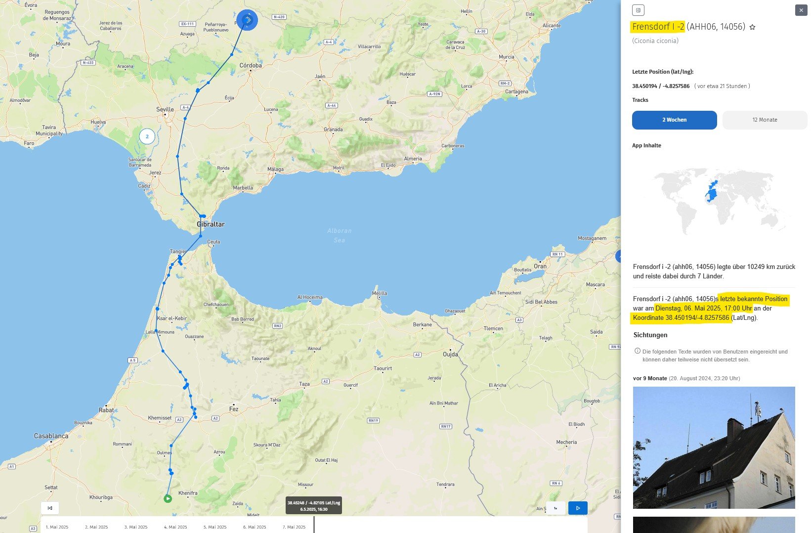 Sie überwinterte vom 13. Oktober 2024 bis 19. März in Zentral-Mali, im Gebiet des Niger, und hat sich auch schon recht zielstrebig auf den Weg nach Norden gemacht, Marokko sogar am 30. April über die Gibraltar-Meerenge verlassen.