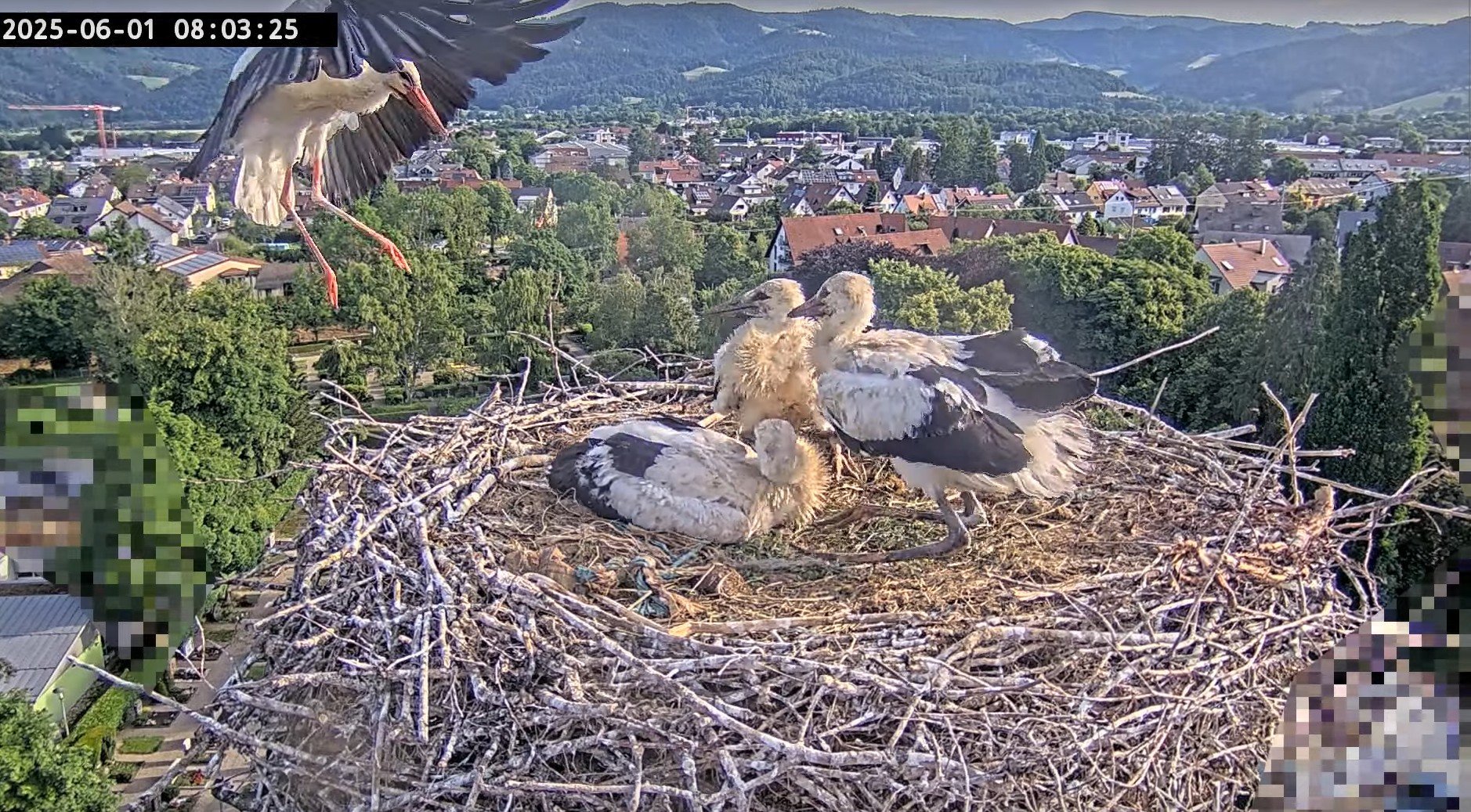 1. Juni 2025, 8:03 Uhr: Schon wieder sind die drei allein und wieder ist ein Fremdstorch da.