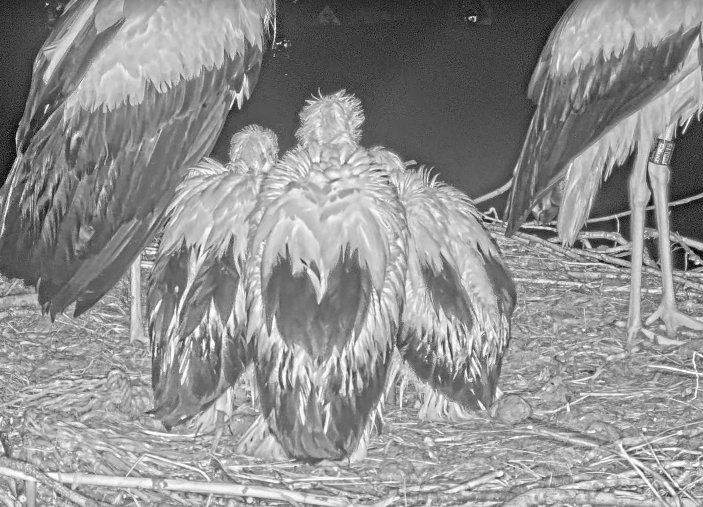 Das ist gut für die Futtersuche, weniger gut für die Jungstörche, da sie noch kein fertiges Deckengefieder besitzen.