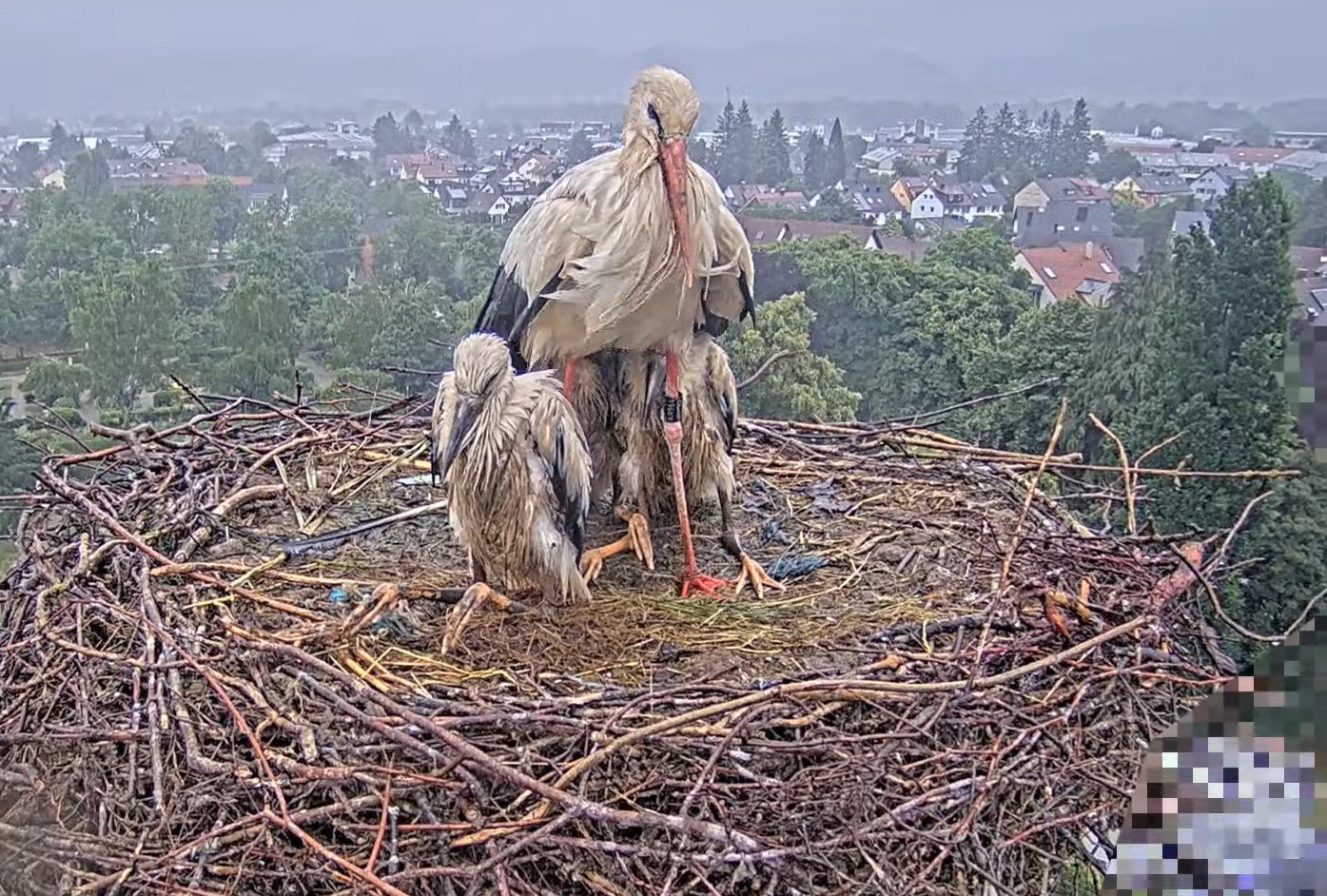2. Juni 2025, 17:44 Uhr: Wieder ein ordentlicher Regenschauer. Edgar fungiert als Regenschirm für Fips und Socke (rechts hinten).<br />Elisha Jo (vorne links) erträgt es mit Fassung, dass sie als dritter Jungstorch nicht mehr darunterpasst.