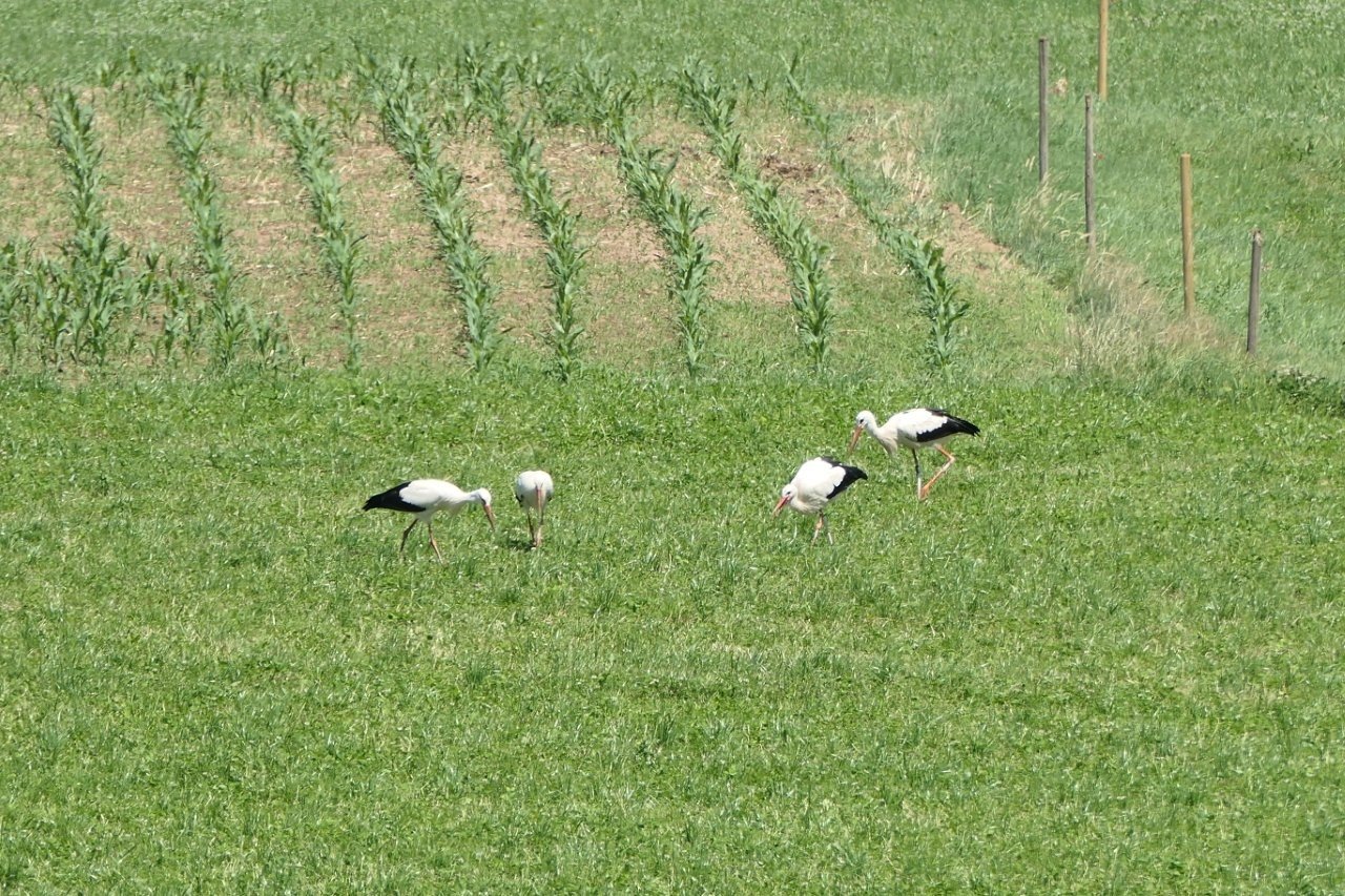Herr Bickel konnte zur Mittagszeit Frankie auf den Wiesen des Giersberg entdecken. Zuvor hatte er dort lediglich Ulla und Edgar mit ihren Jungstörchen, zwei weitere Jungstörche sowie fünf unberingte Störche beobachten können. Gerade als er sein Spektiv zusammengepackt hatte, flog plötzlich ein einzelner Storch ein. Wie schön, dass für diesen einzelnen Storch das Spektiv nochmals ausgepackt wurde – es war nämlich Frankie!