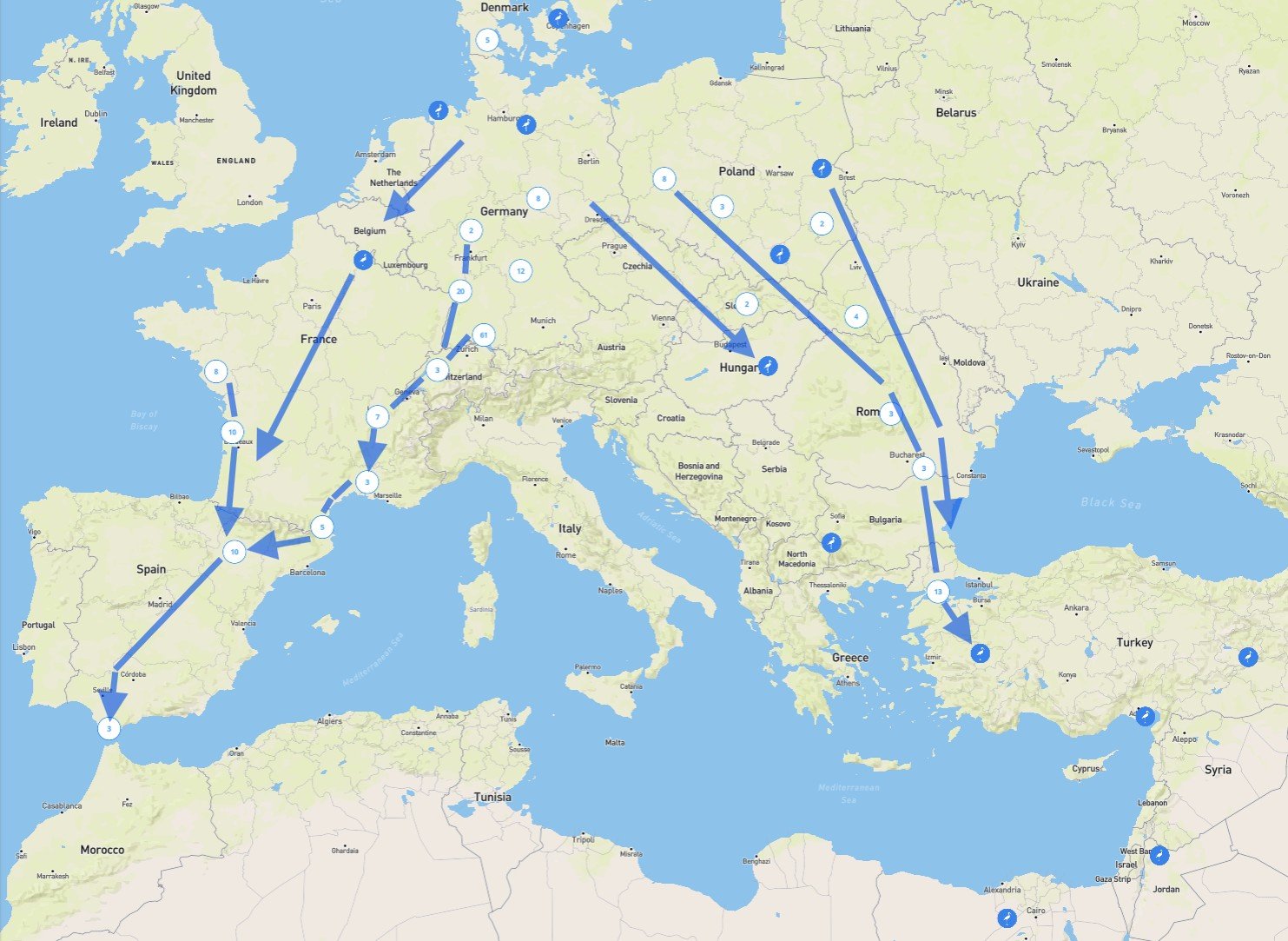 Die gemeinsame Zeit von BRILLIANT und SMARAGD seit ihrer Freilassung am Sonntag. Bis heute Nachmittag ca. 16.00 haben sie sich in demselben Trupp befunden, dann haben sich die Wege um wenige Kilometer getrennt. Mal schauen, ob sie wieder zusammenfinden.