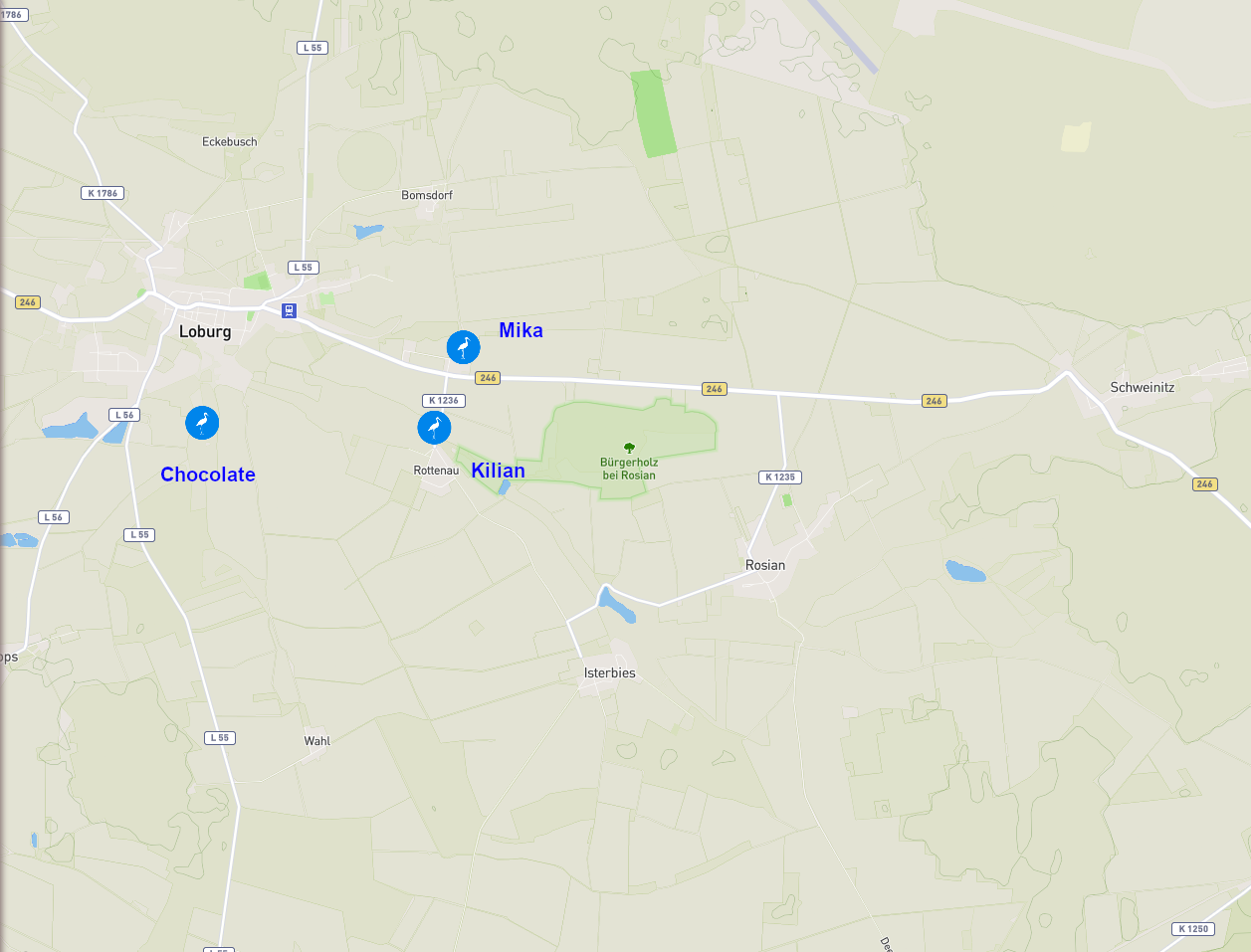 Die drei Senderstörche aus 2025 sind aktuell noch nahe Loburg.