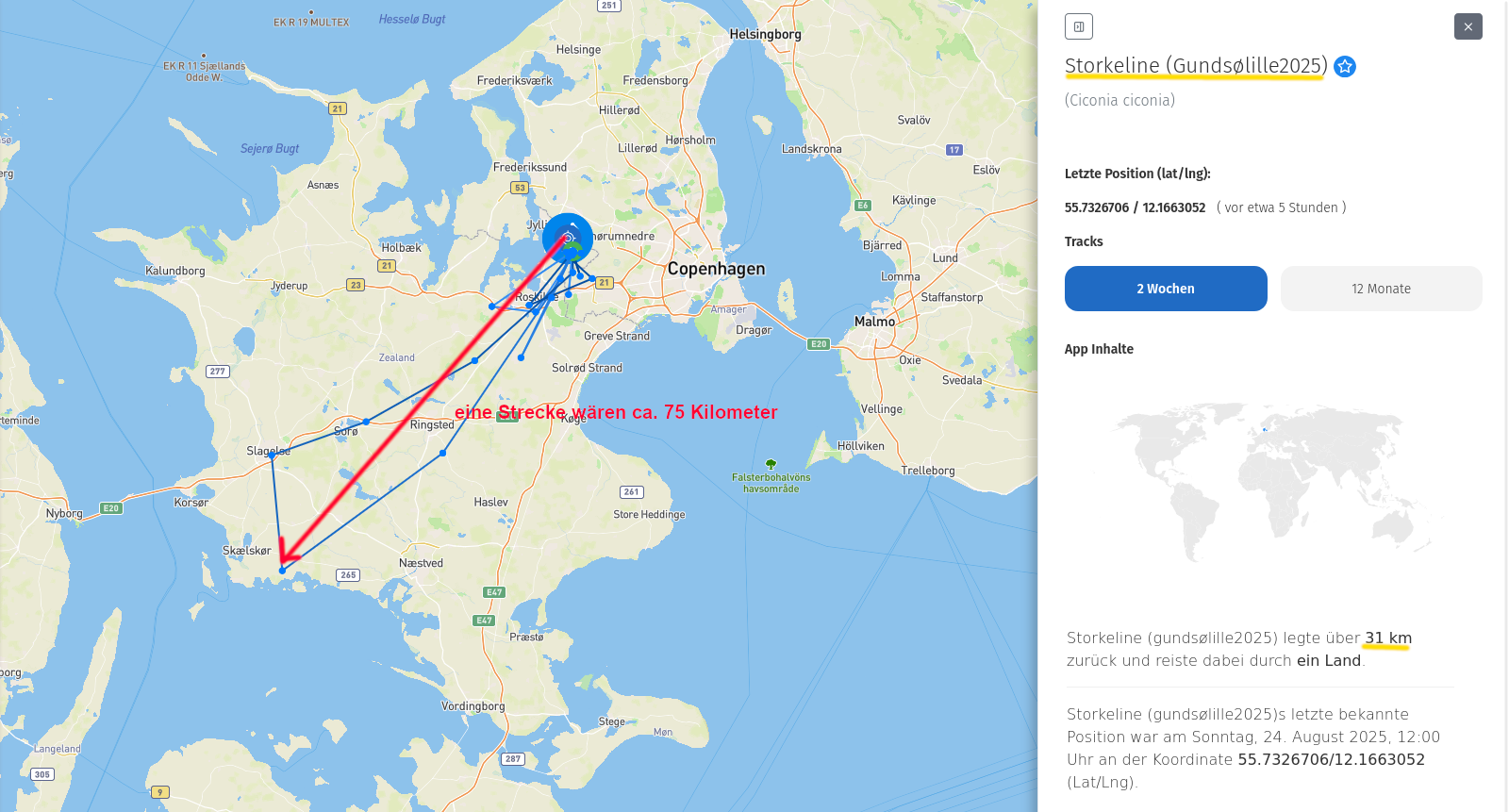 Ich bringe mal als Beispiel Storkeline (Gundsølille2025) in Dänemark. Sie ist auf dem Nest in Gundsolille geboren worden. Nach der Besenderung flog sie dann eine Weile in der Nest-Nähe-Umgebung umher. Irgendwann flog sie sogar bis Roskilde. Und dann flog sie noch weiter bis Westen an die Küste von Seeland - kehrte aber dann wieder um und flog zurück nach Hause. Im AT stehen bei ihr auf dem Tacho aber lediglich 31 Kilometer. Allein die beiden Strecken an die Küste und zurück, sind deutlich mehr als 100 Kilometer. Das erscheint mir absolut nicht stimmig.