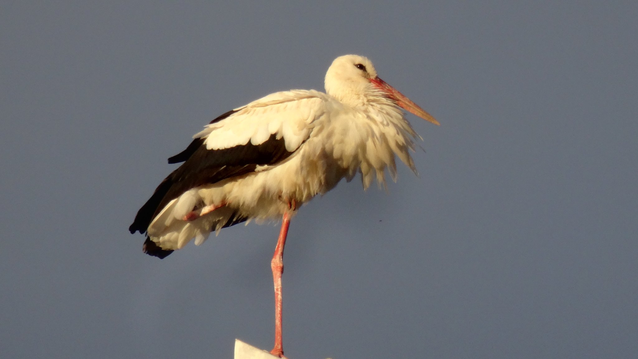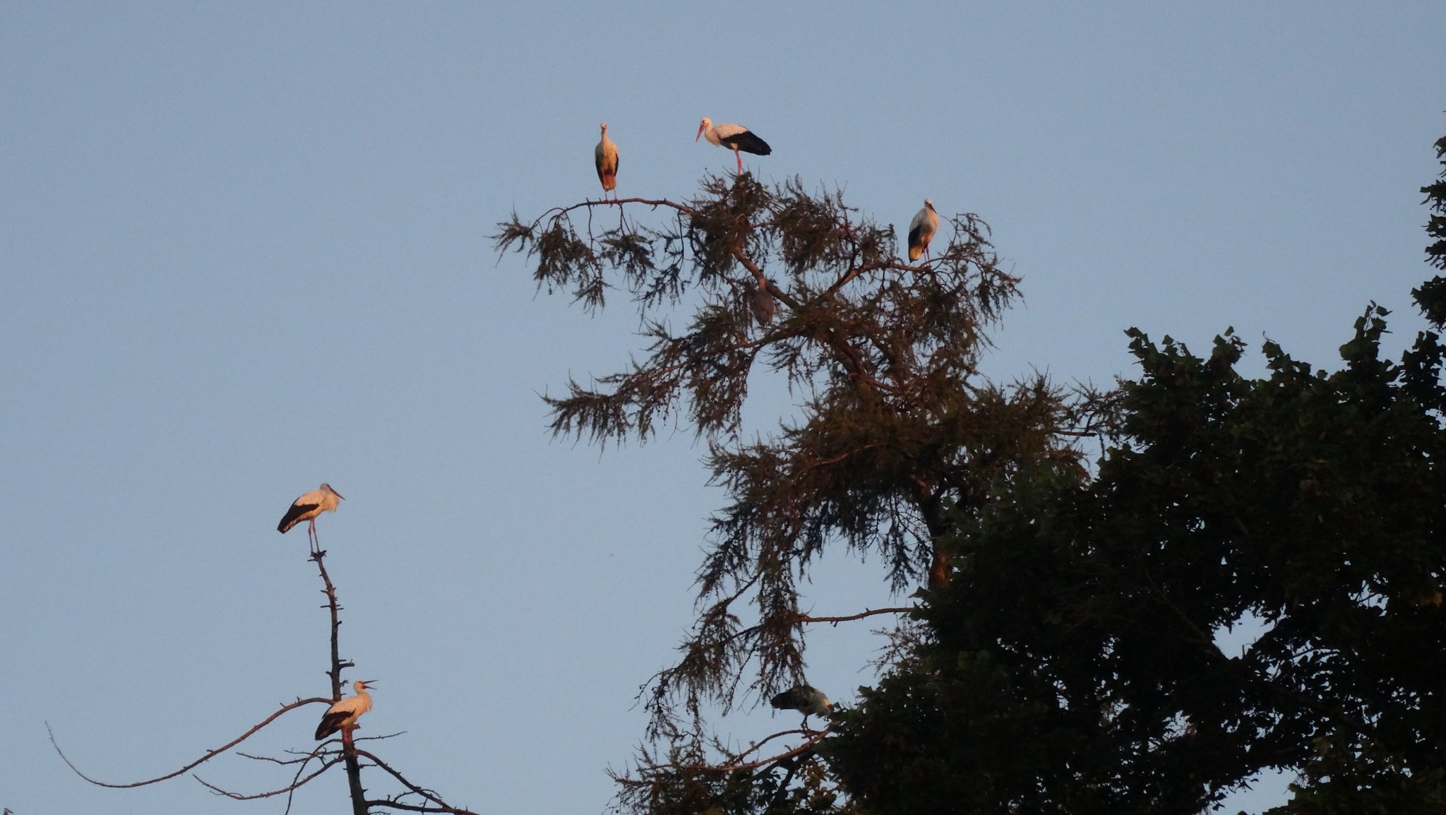 Bereits am frühen Abend hat Frankie seinen Schlafplatz auf dem Schlauchturm des Feuerwehrhauses aufgesucht und genoss dort die letzten Sonnenstrahlen. Kurz darauf gesellte sich ein weiterer - leider unberingter - Storch zu ihm.
