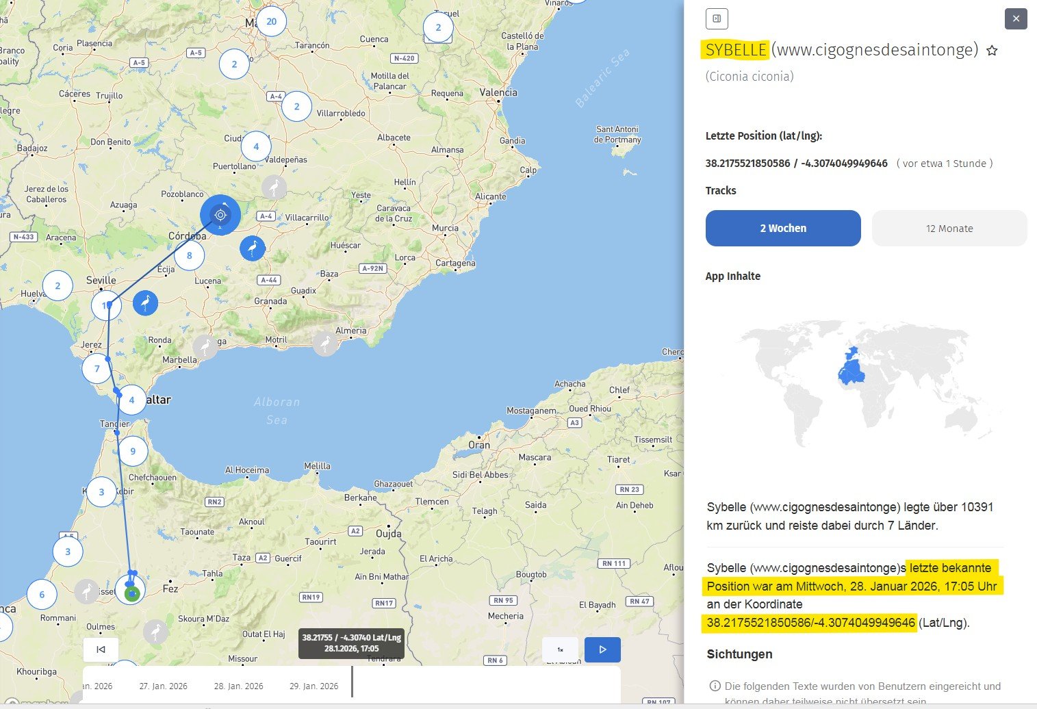 Liebe Leute, hier kommt ein kurzer Nachtrag zu gestern: SYBELLE (www.cigognesdesaintonge) war direkt beim Überflug über die Straße von Gibraltar getrackt worden. Deshalb war es spannend, zu sehen, ob sie es tatsächlich heile auf das spanische Festland geschafft hat.