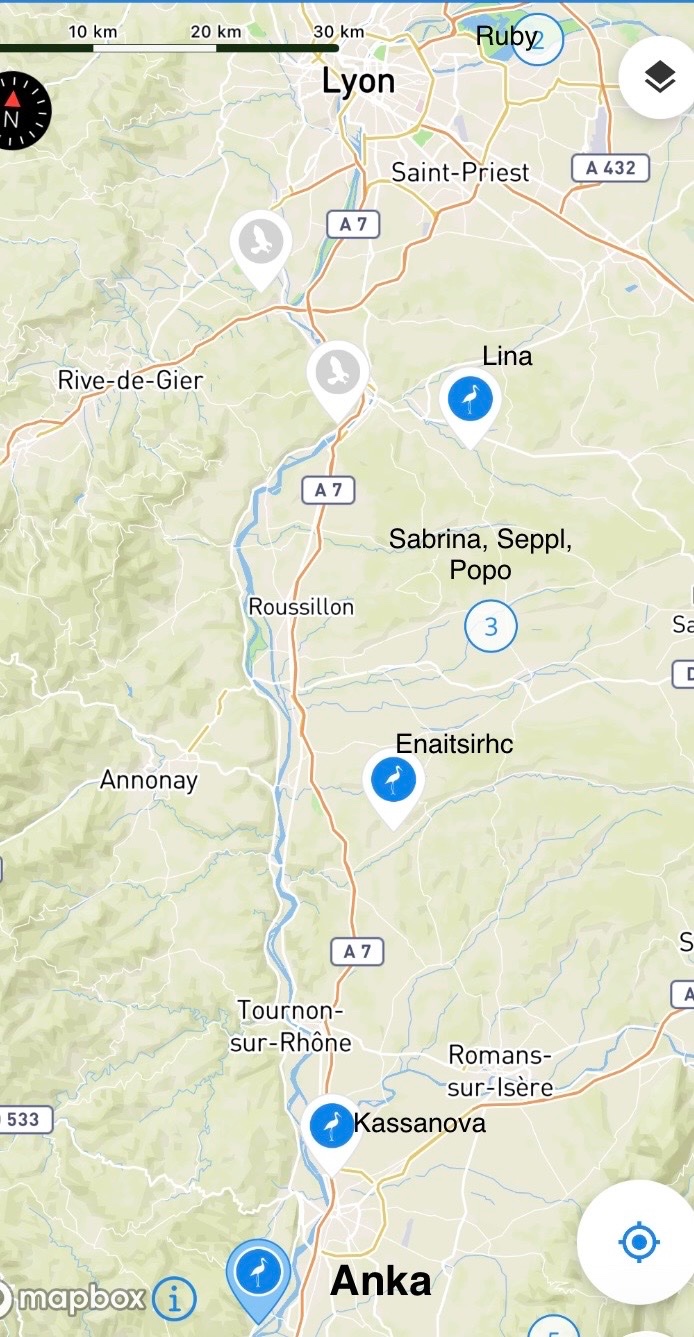 Unzhurst 2 ist am 12.2. aus seinem Überwinterungsgebiet bei Ciudad Real in Spanien aufgebrochen und befand sich heute bei seiner letzten Ortung nahe Perpignan, s. Screenshot aus dem Animaltracker: Anka aus Seinstedt im Landkreis Wolfenbüttel hat nahe Nimes überwintert und ist dort gestern losgeflogen. Heute hat sie etwa 60 Km südlich von Lyon gesendet: Interessant ist, wie viele Senderstörche sich gerade im Großraum Lyon aufhalten: Zu guter Letzt noch ein Hinweis auf den französischen Storch Charlie sowie Sissi und Christian, die im Senegal zur Überwinterung waren. Alle drei wurden aktuell nahe Marrakesh geortet.