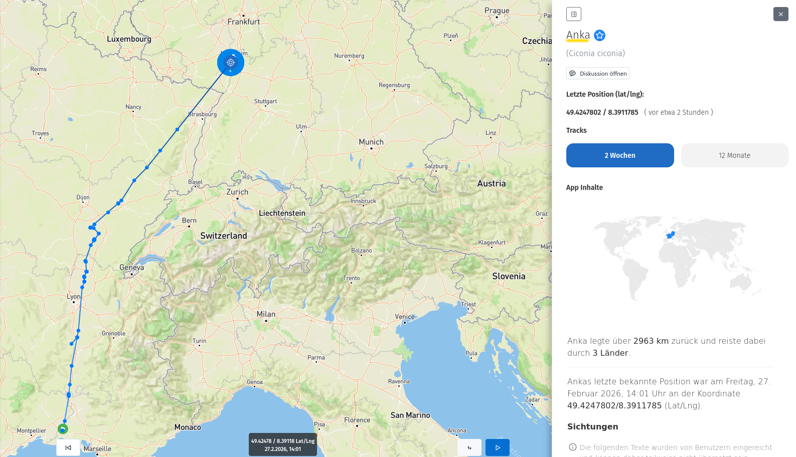 Sie ist richtig gut vorangekommen und bereits auf der Höhe von Heidelberg, etwas südlich von Mannheim. Bis 'nach Hause', also zum Nest in Seinstedt in Niedersachsen, sind es Luftlinie noch knapp 340 Kilometer. Wenn das Wetter günstig bleibt, könnte Anka also bereits morgen oder Sonntag am Ziel sein.