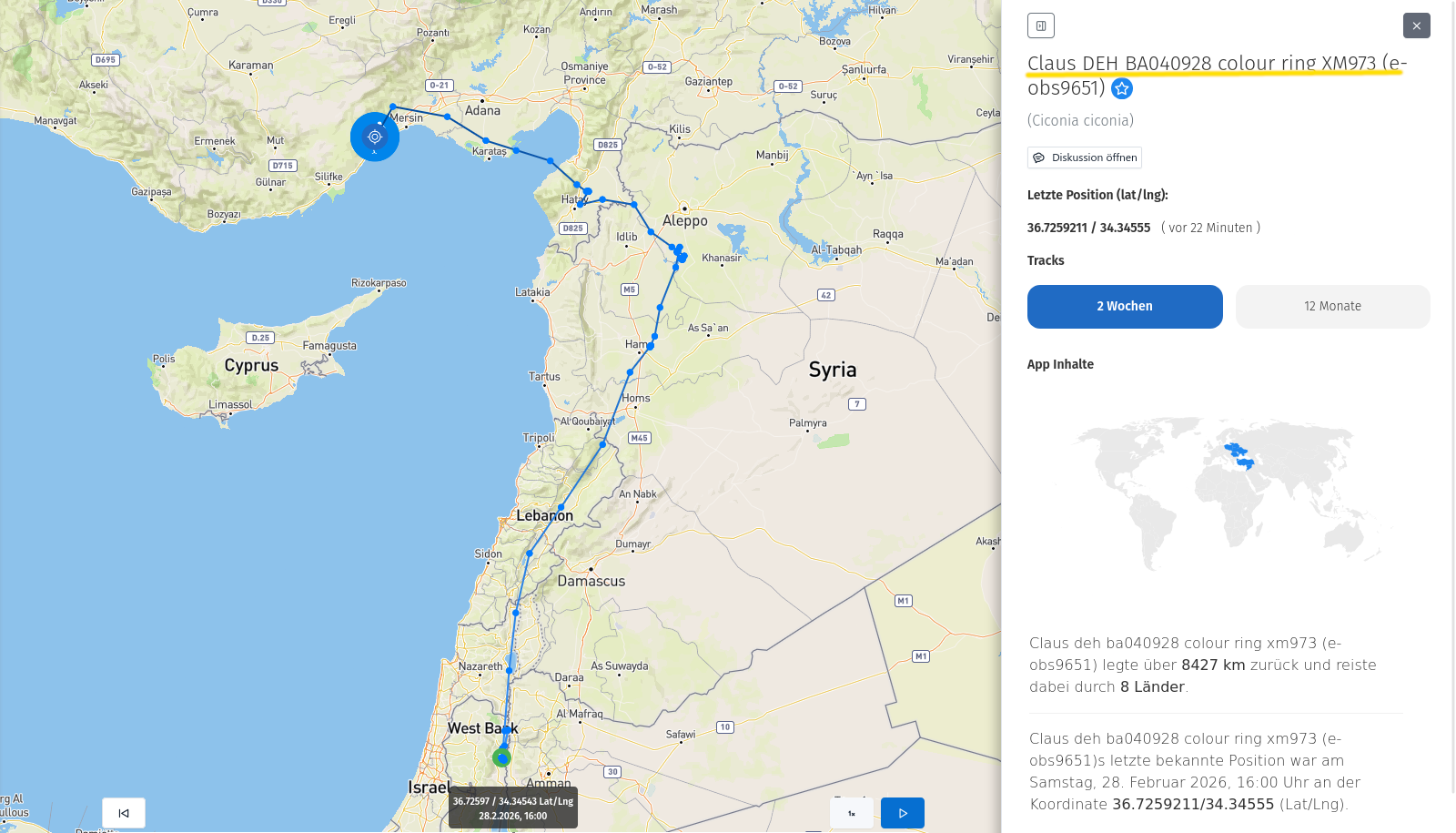 Liebe BSine, vielen Dank für die erfreulichen Nachrichten!BSine hat geschrieben: Fr 27. Feb 2026, 18:16 Auf den Weg hat sich nun endgültig auch Claus gemacht. Er ist bereits im Süden der Türkei angekommen. Pettstadt1 begleitet ihn laut AT nicht. Ob Basuto ebenfalls aufgebrochen ist, lässt sich noch nicht sagen, da er zuletzt am 24.2. gesendet hat. Claus ist am 25.2. losgeflogen. Es bleibt spannend, ob er in seine Heimat Deutschland zurückkehrt oder zu seinem letztjährigen Brutnest in Litauen.