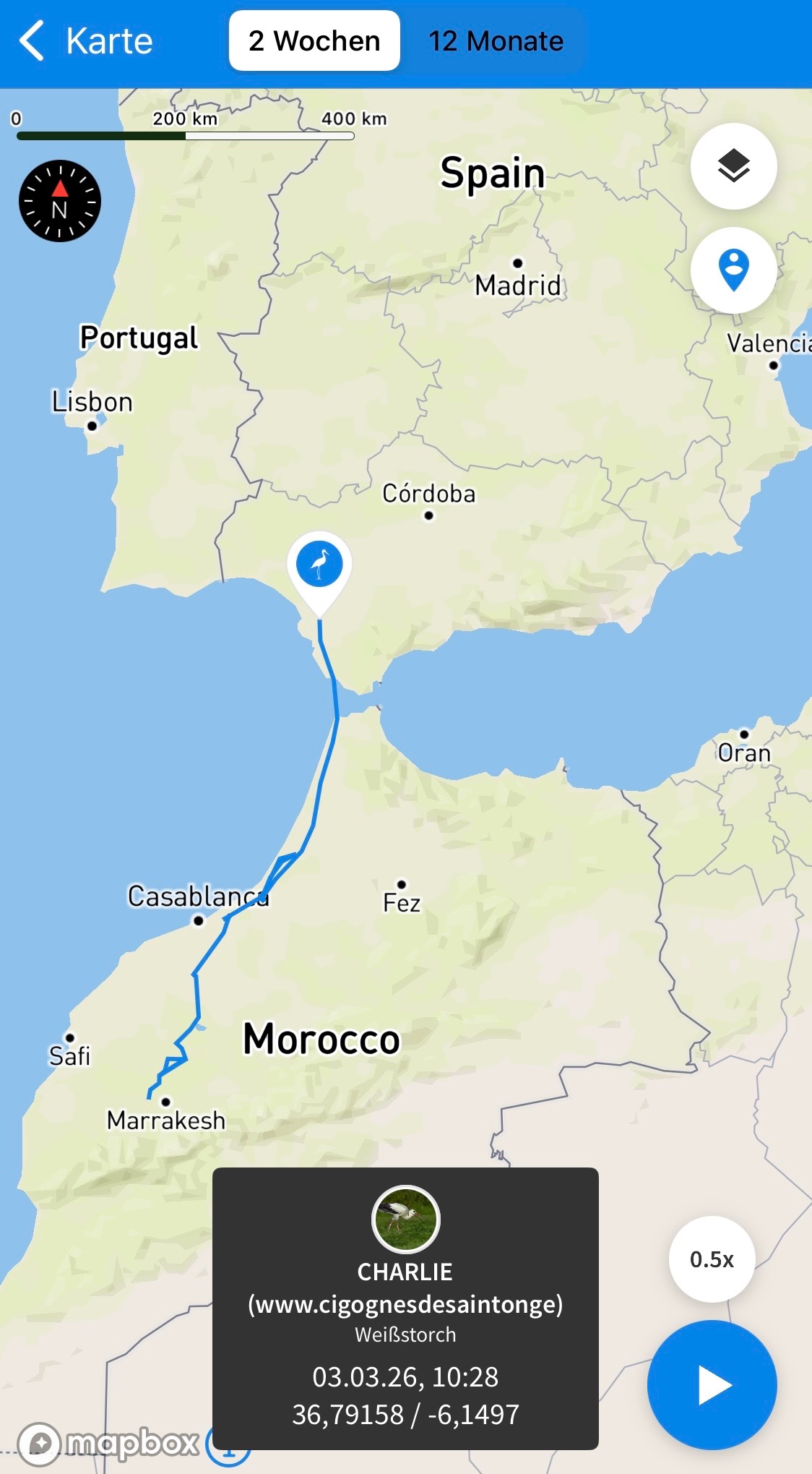 Ich hatte ja bereits berichtet, dass drei von mir favorisierte französische Senderstörche (Oceane, Sybelle und Marleau) mittlerweile wieder gut in ihrer Heimat angekommen sind. Der vierte im Bunde, Charlie, hat gestern die Meerenge von Gibraltar passiert und wurde heute etwa 10 Km nördlich von Jerez geortet. Herzliche Grüße ! BSine