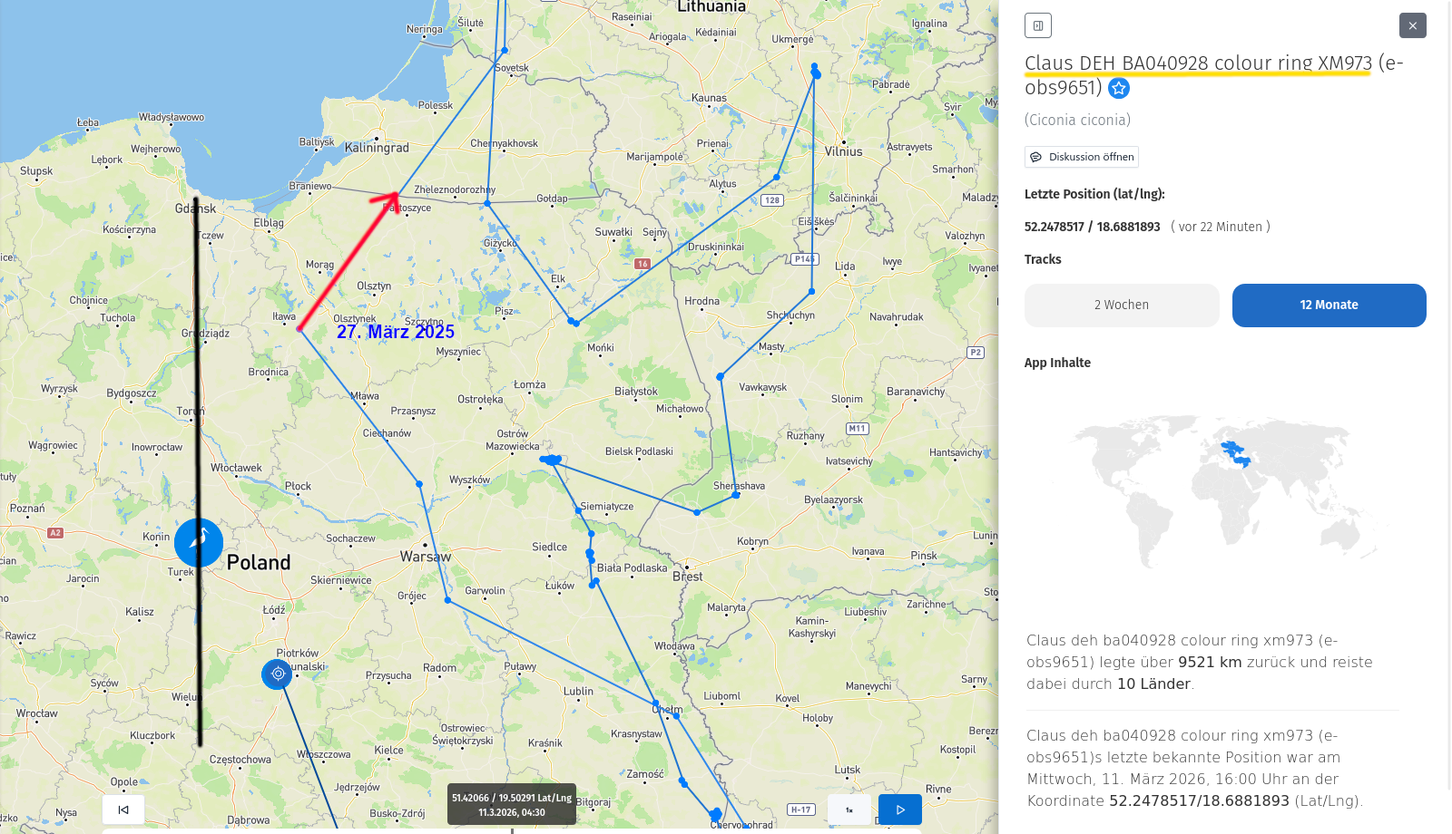 Im Bild sieht man (rot) den Richtungspfeil von dort, wo er am 27. März 2025 seinen Ausflug nach Litauen begonnen hat.