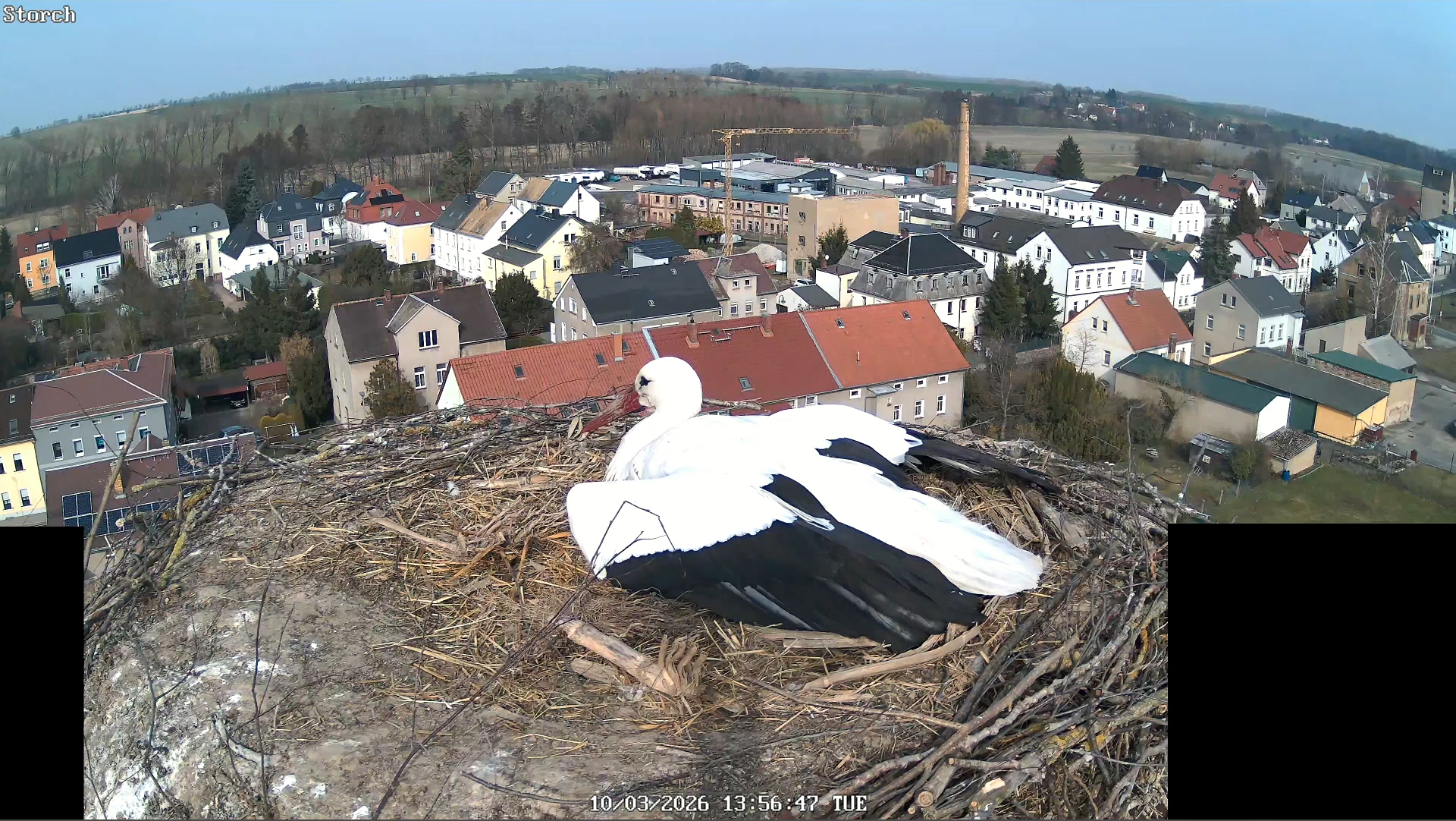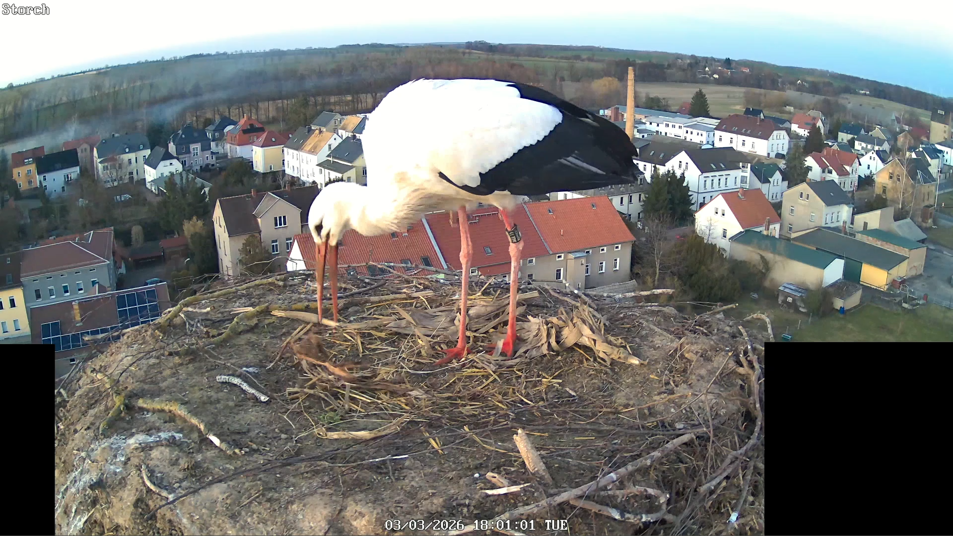 Heute Abend standen laut Webcam in Mügeln zwei Störche auf dem Nest auf der ehemaligen Variaesse.(Screenshot von Webcam)