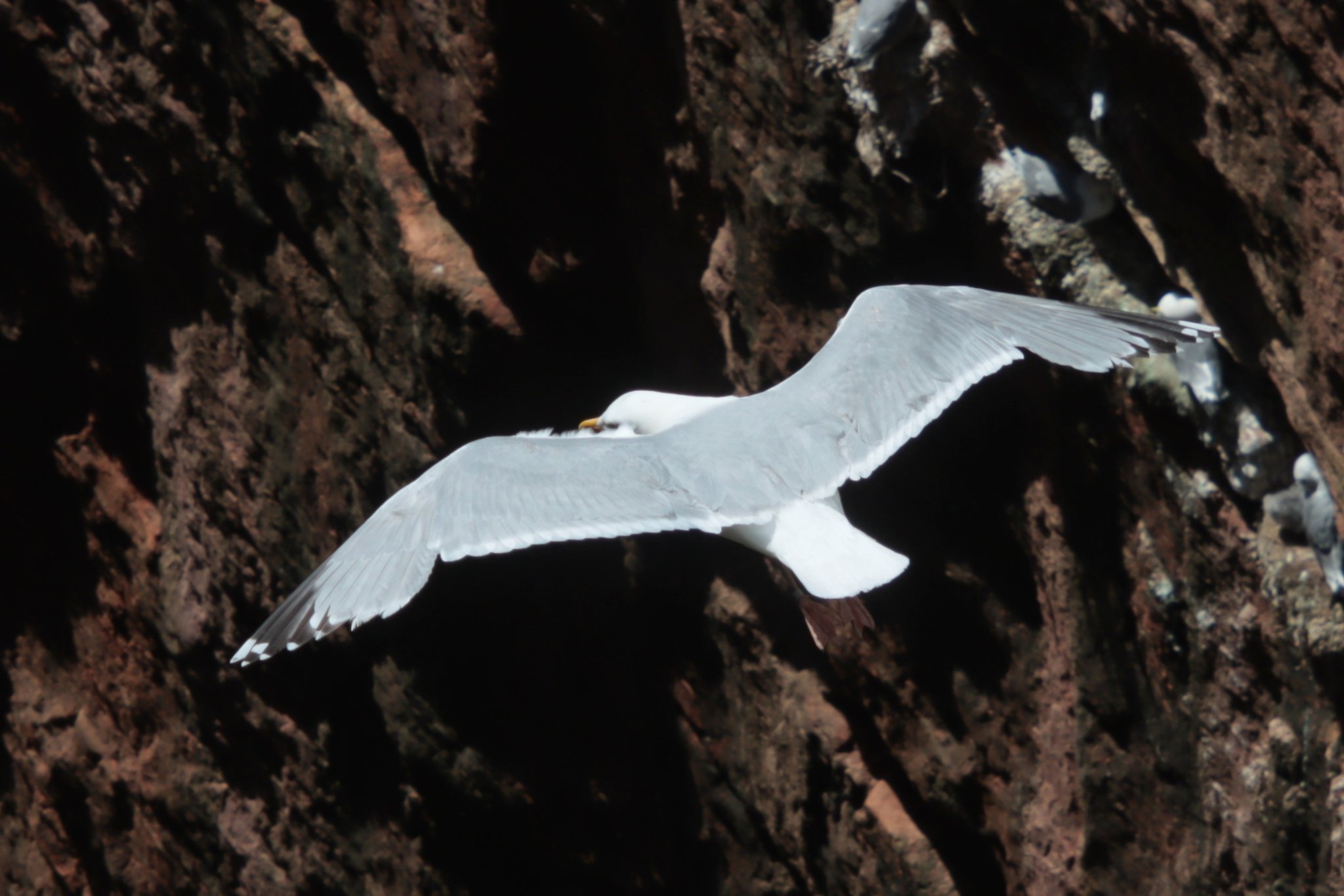 Dreizehenmöwen sitzen tatsächlich im Hintergrund in den Felsen aber für die Möwe im Flug schließe ich das eigentlich aus. Dreizehenmöwen haben meines Wissens schwarze Füße und die Flügelspitzen sind komplett schwarz.