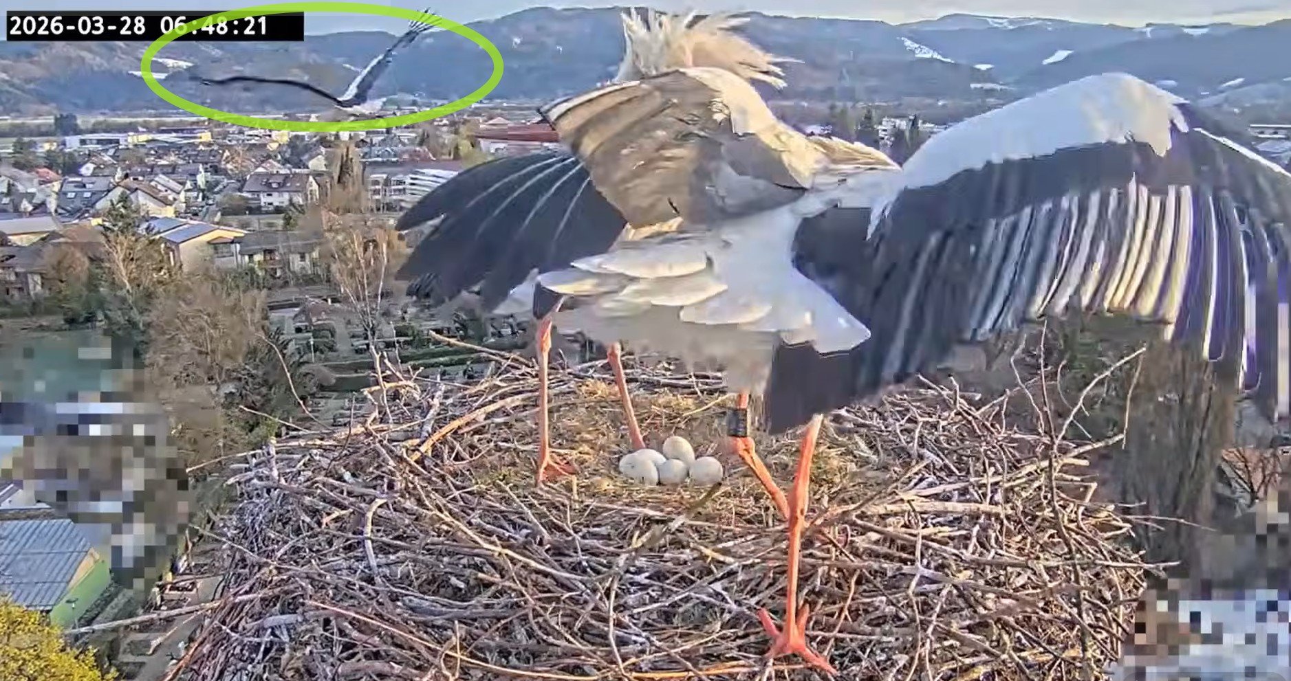 Vor 7 Uhr wehrt Edgar (verdeckt) einen heranfliegenden Fremdstorch (grün markiert) ab, der Ulla (vorne), nach ihrem Frühstück zum Nest verfolgte.