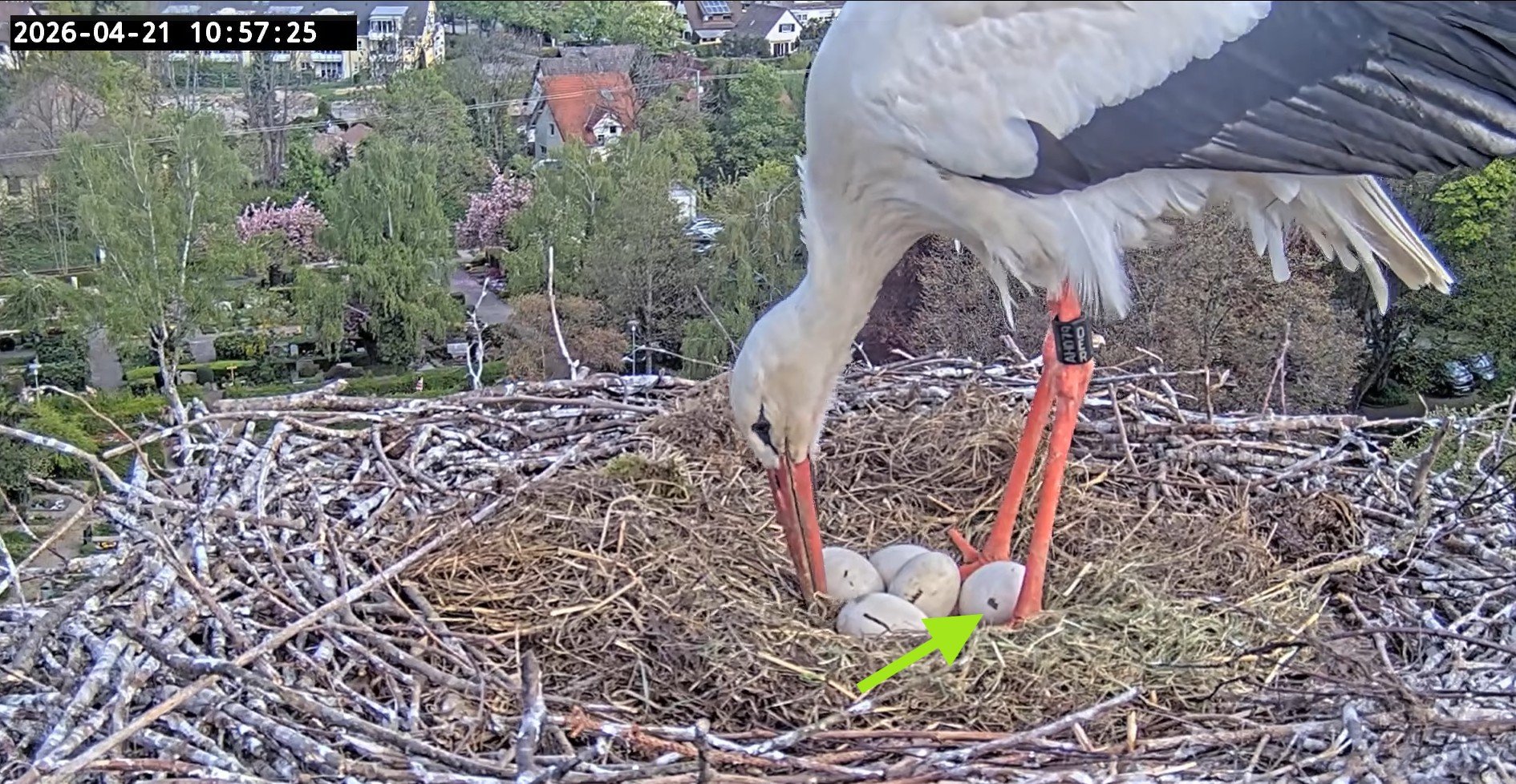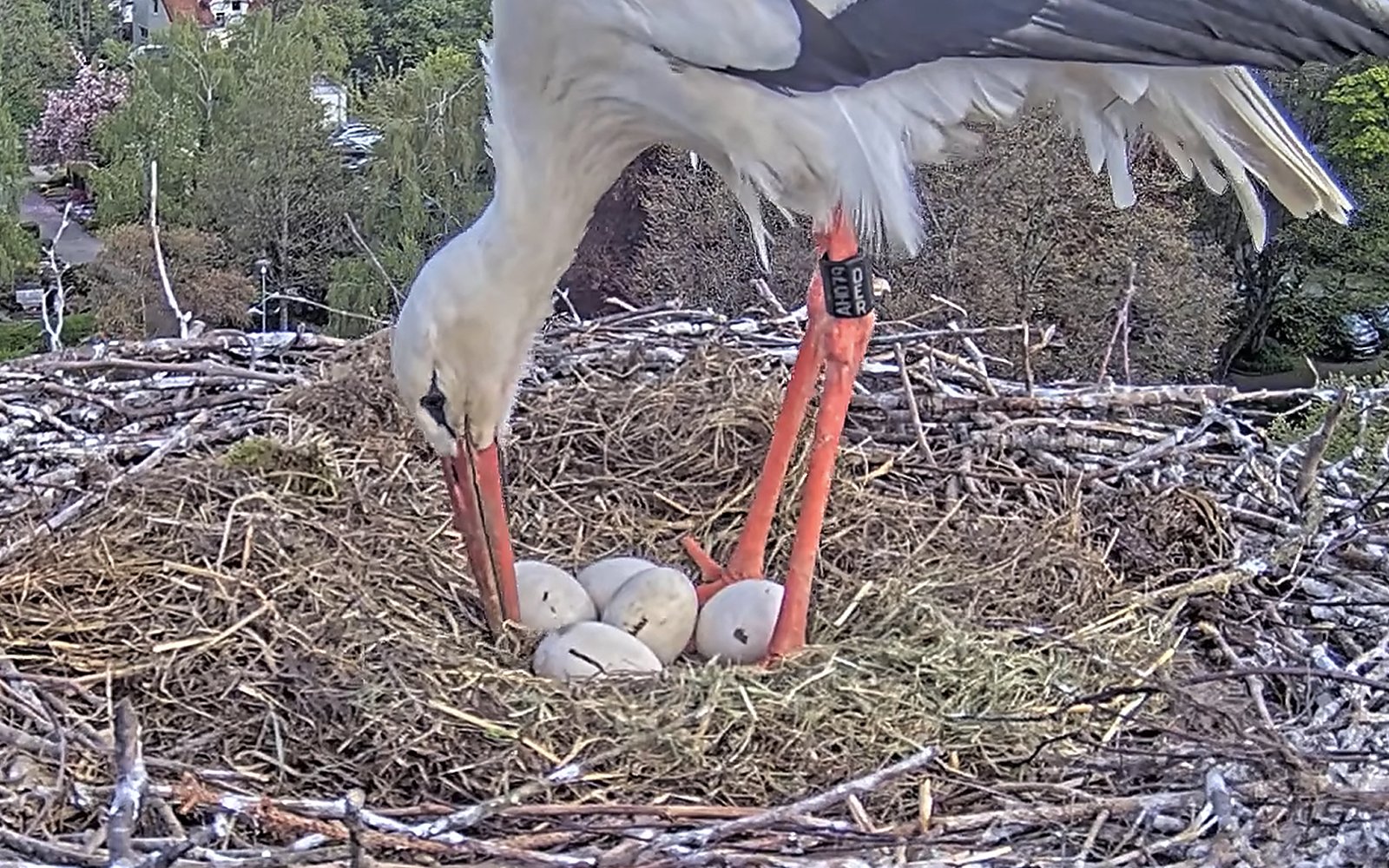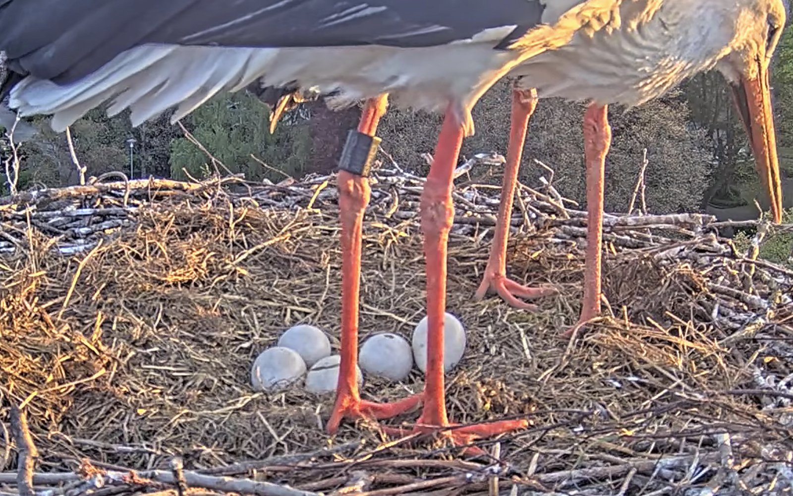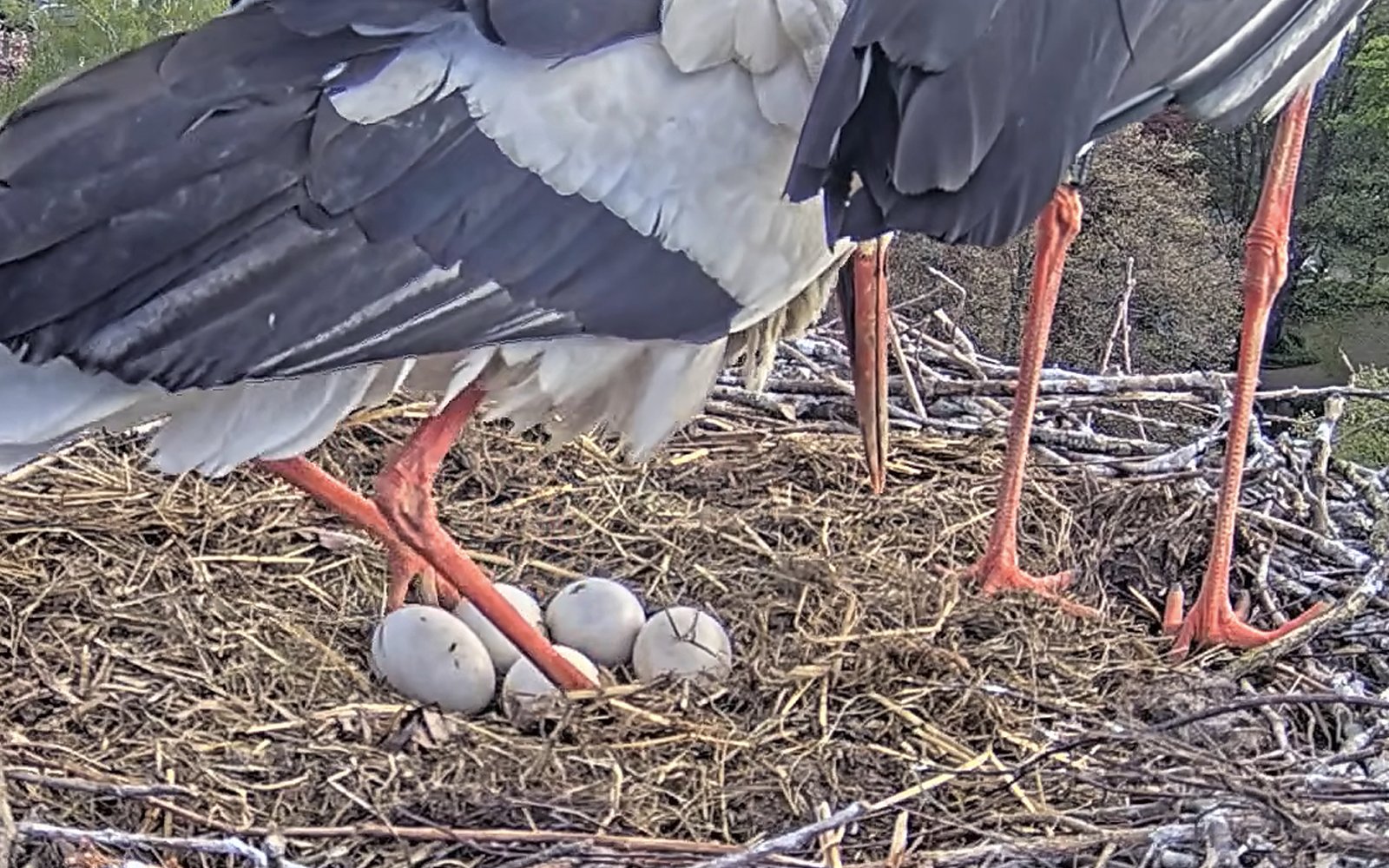 Offenbar haben die vier Eier die Kälte durch das Gefieder der Storcheneltern und das trocken und sauber gehaltene Nest gut überstanden: