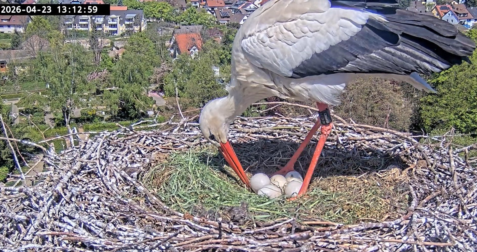 Offenbar haben die vier Eier die Kälte durch das Gefieder der Storcheneltern und das trocken und sauber gehaltene Nest gut überstanden: