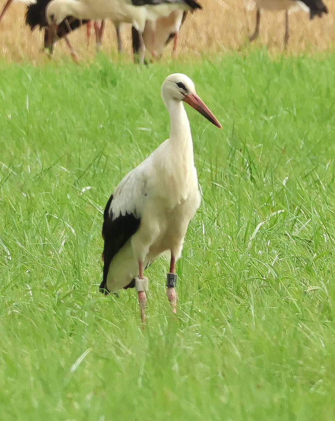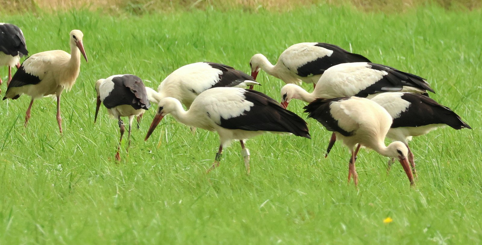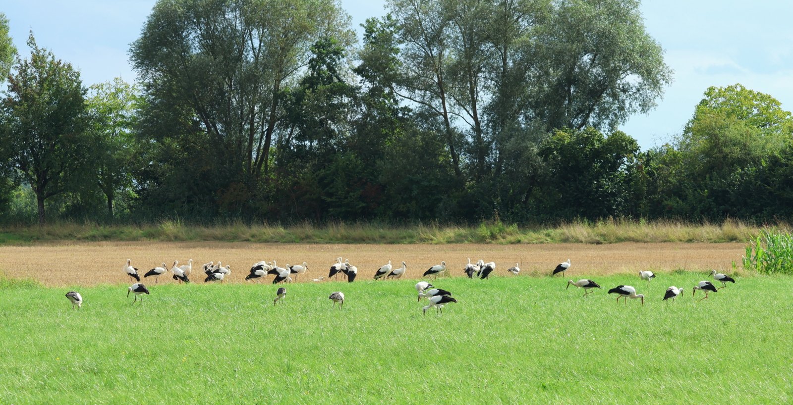 gestern sah ich im AT, dass die Senderstörchin Gudrun AKL13 10187, die dieses Jahr in Iffezheim bei Baden-Baden geschlüpft ist und diesen neuen Beinsender trägt, ein kleines Stückchen weiter Richtung Süden gekommen und zu der Truppe von Unzhurst2 dazugestoßen war, die sich nach wie vor noch hier in der Nähe von Offenburg-Griesheim aufhält. Ich bin natürlich ins Auto gejumpt und hingefahren, es war ein unheimlich schönes Bild diese große Gruppe an Störchen zu sehen, nur leider hielten sie sich auf einer sehr großen Wiese auf und für mich gab es keinerlei Möglichkeiten mich zu verstecken, daher kam ich nicht nah genug ran um halbwegs gute Fotos zu bekommen, aber das Wichtigste ist, ich habe Gudrun ausmachen können.