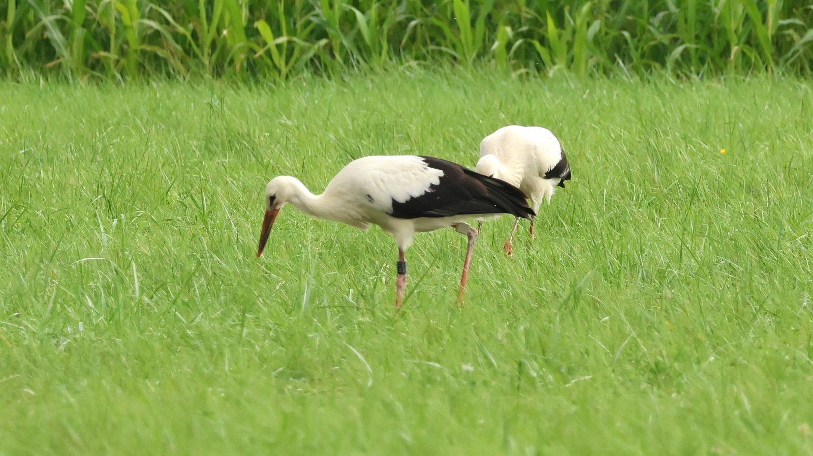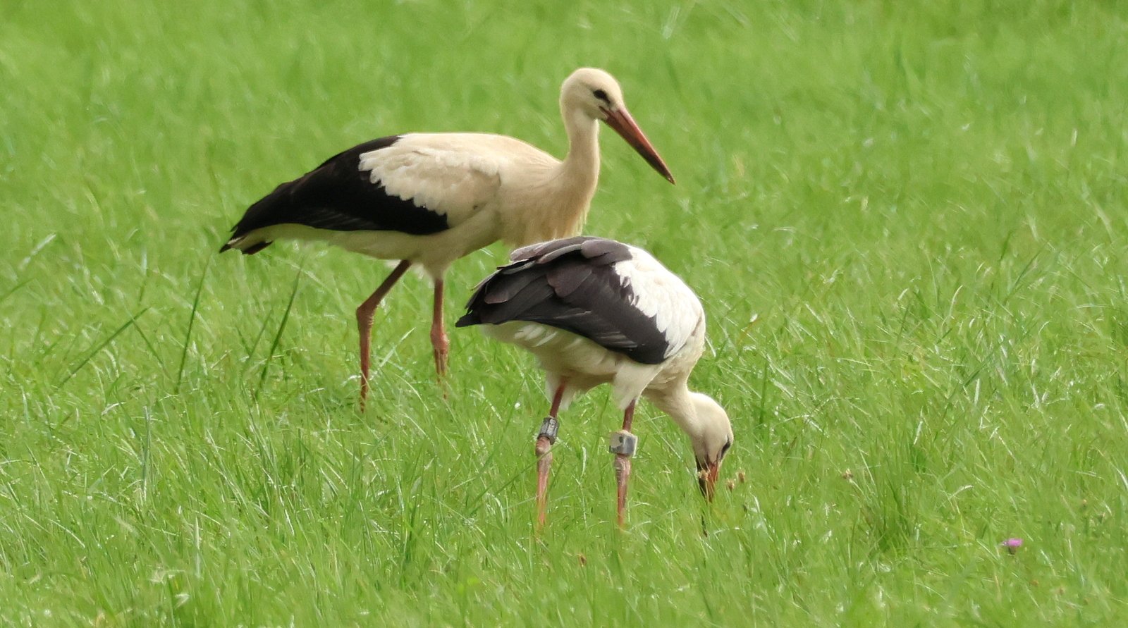Zwei polnische Storchen-Jahrgänge (2024 und 2025) in relativer Nähe zueinander: