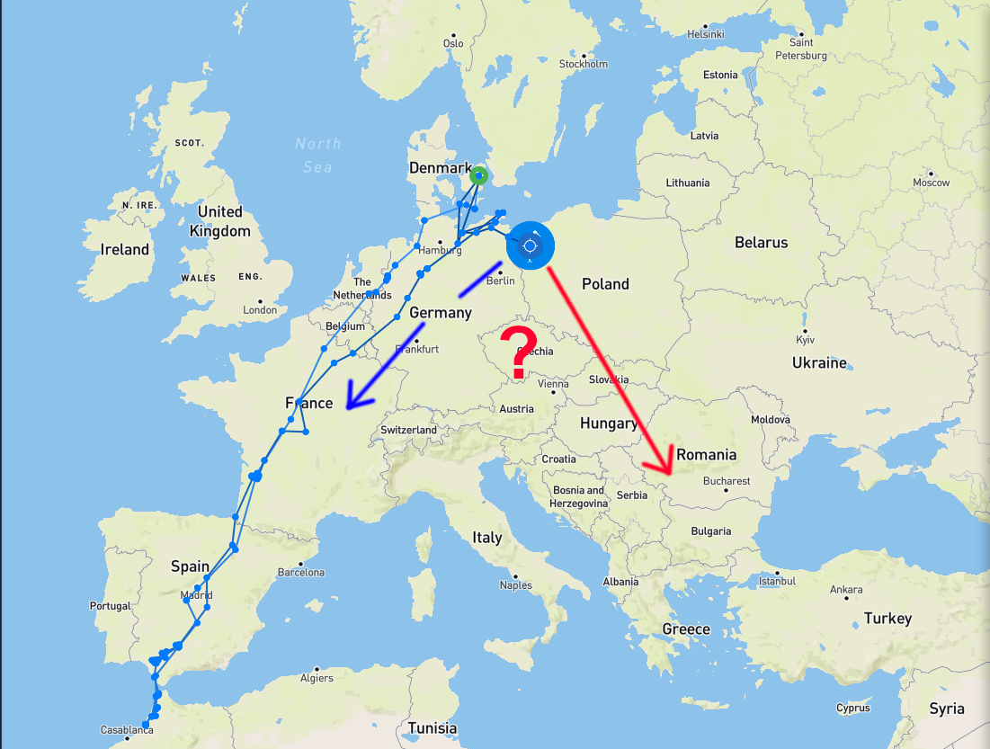 Spannend wird die Frage, welche Route Ole für seinen Rückzug nach Süden wählen wird. Ole ist 2024 geboren worden und in seiner ersten Saison flog er eine klassische West-Route - also durch Frankreich und Spanien - um dann in Marokko anzukommen. Weil er sich in den letzten Wochen (für einen Westzieher) ziemlich weit nach Osten begeben hat, stelle ich mir die Frage, ob er abermals die Weststrecke zur Migration nehmen wird, oder ob er zum Ostzieher mutiert. Ich habe das mal grob vereinfacht hier dargestellt: