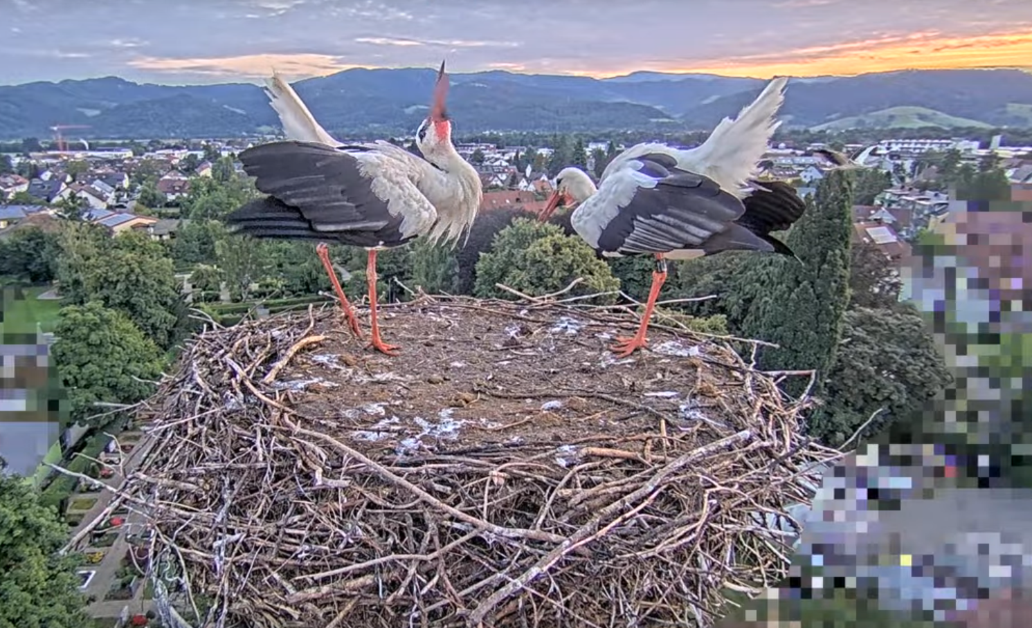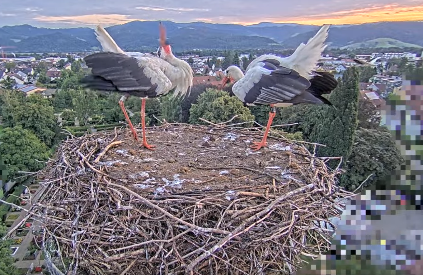 Um 6:16:25 Uhr passierte er dann sein Geburtsnest, in dem Ulla und Edgar gerade standen und ihr Gefieder ausgiebig putzten.
