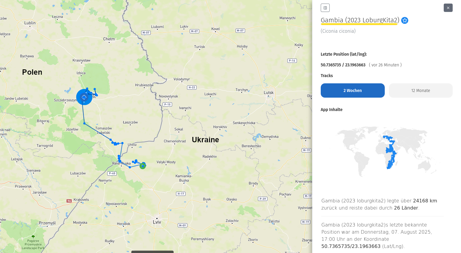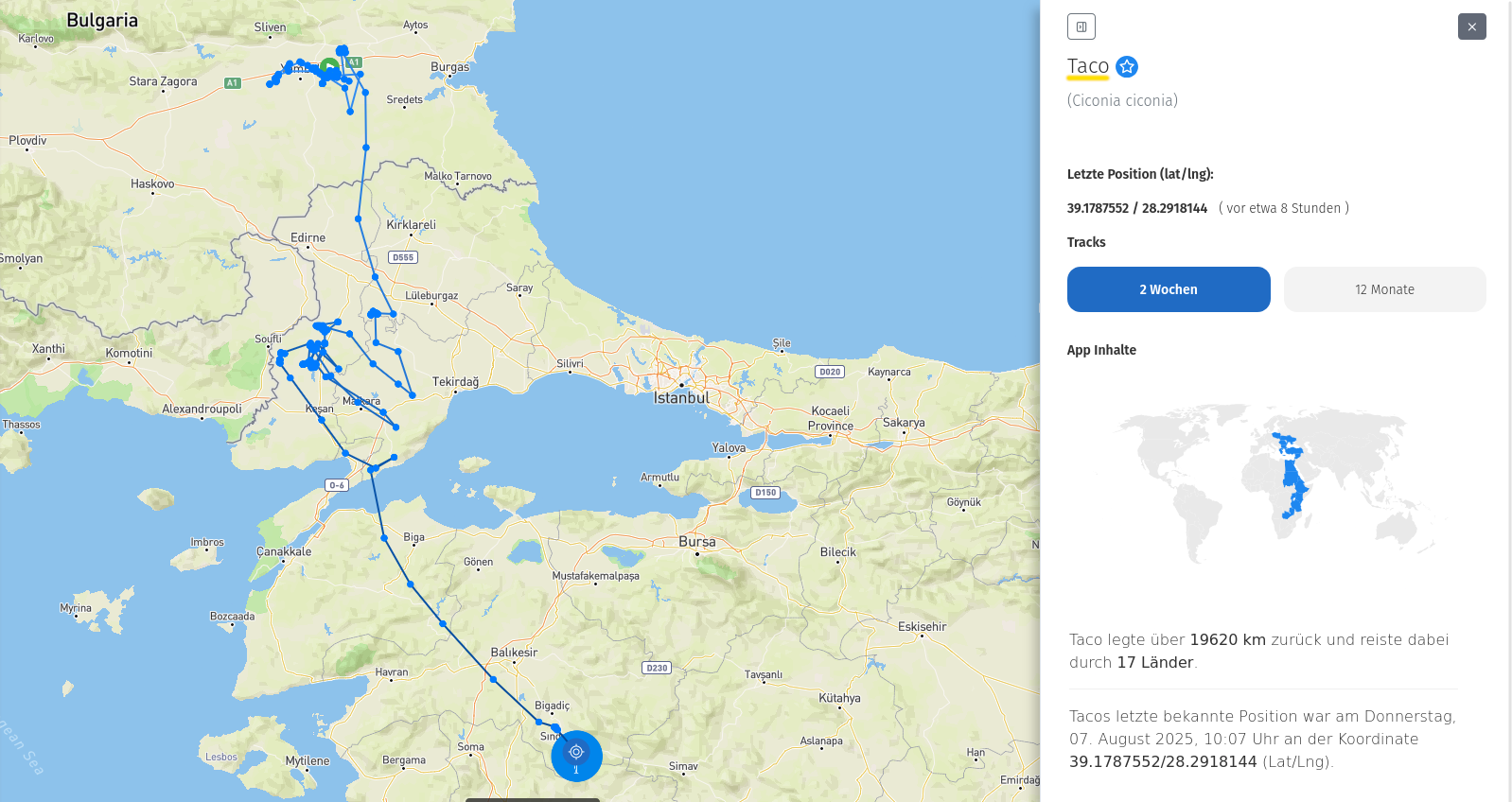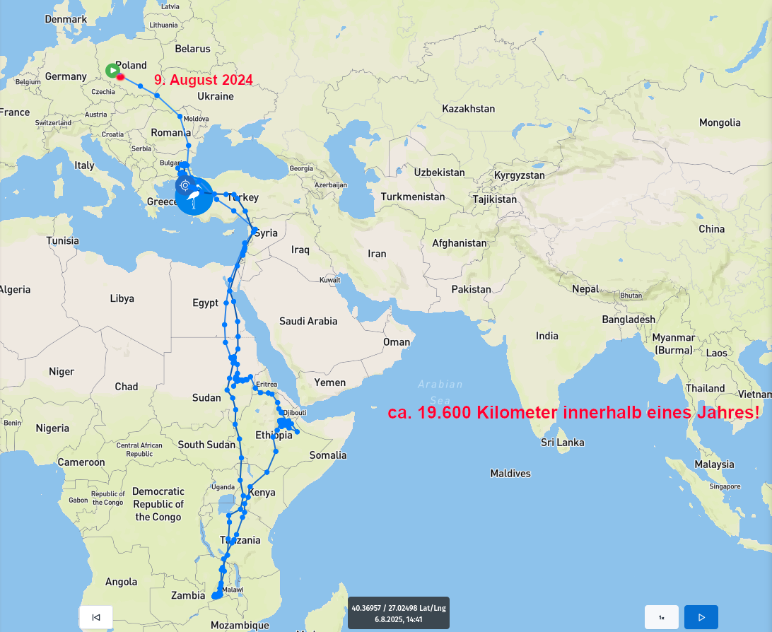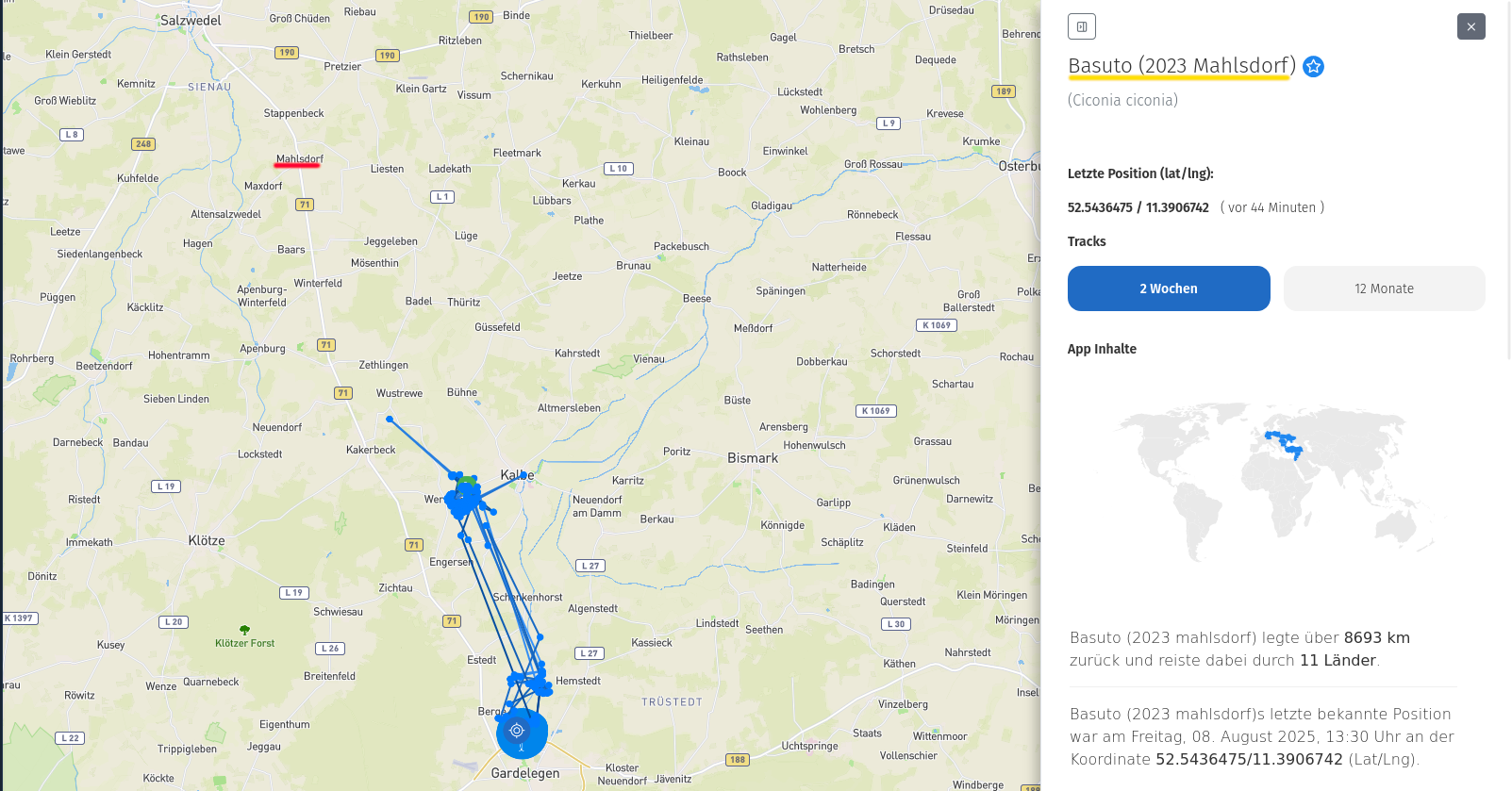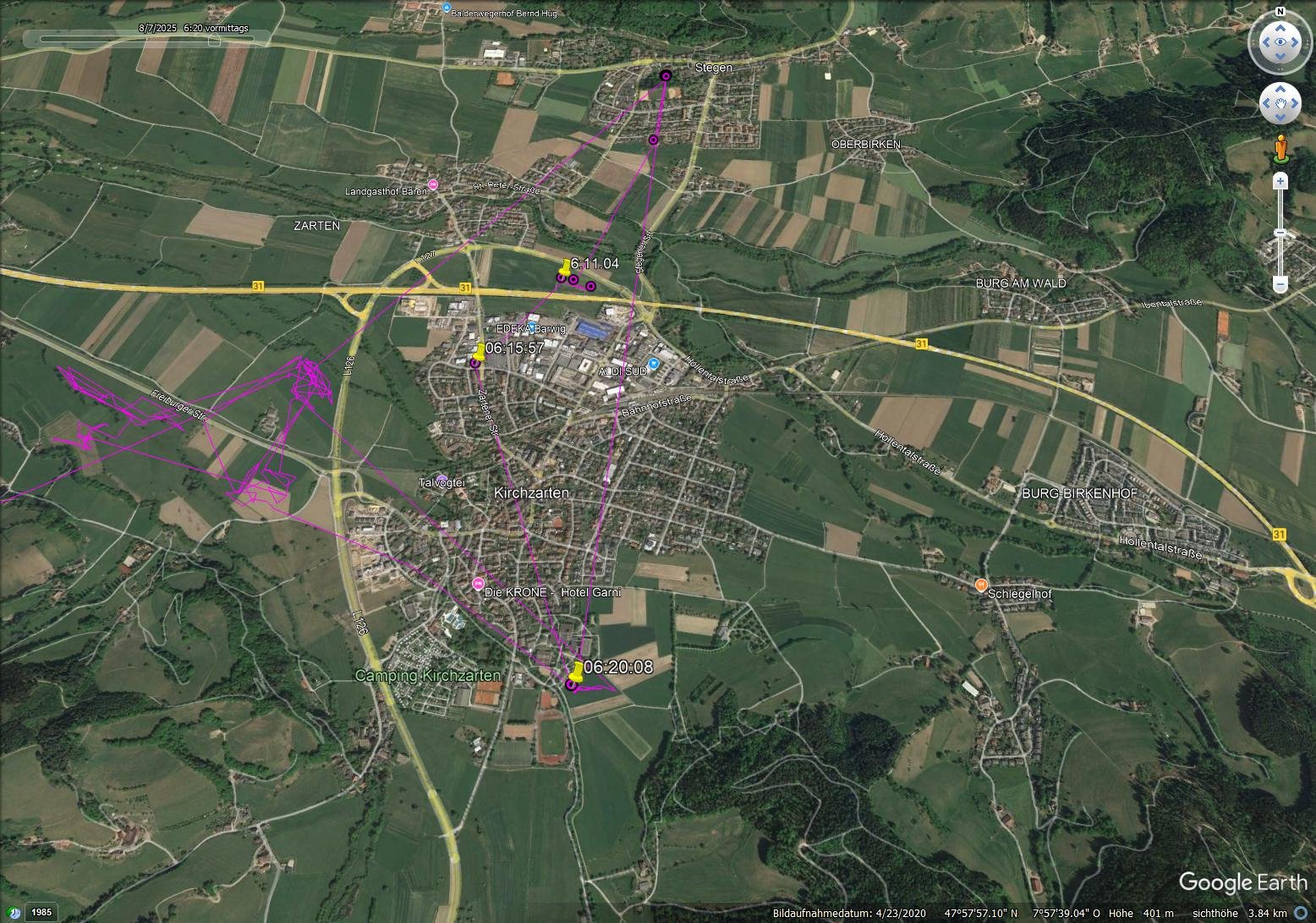 Leider sieht man das nicht im AnimalTracker, daher hab ich seinen Flug von heute Morgen mal grob in Hellblau nachgezeichnet: