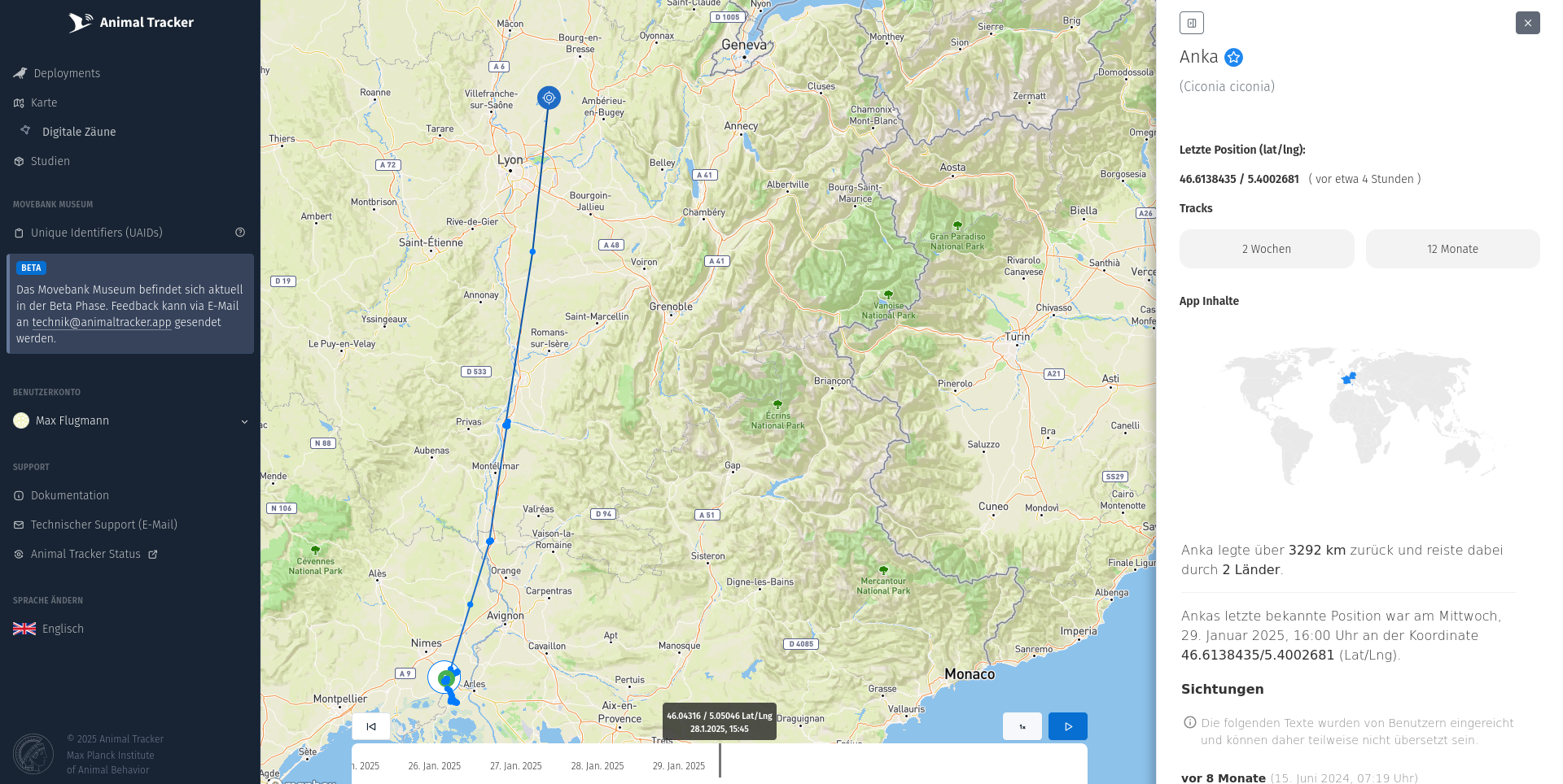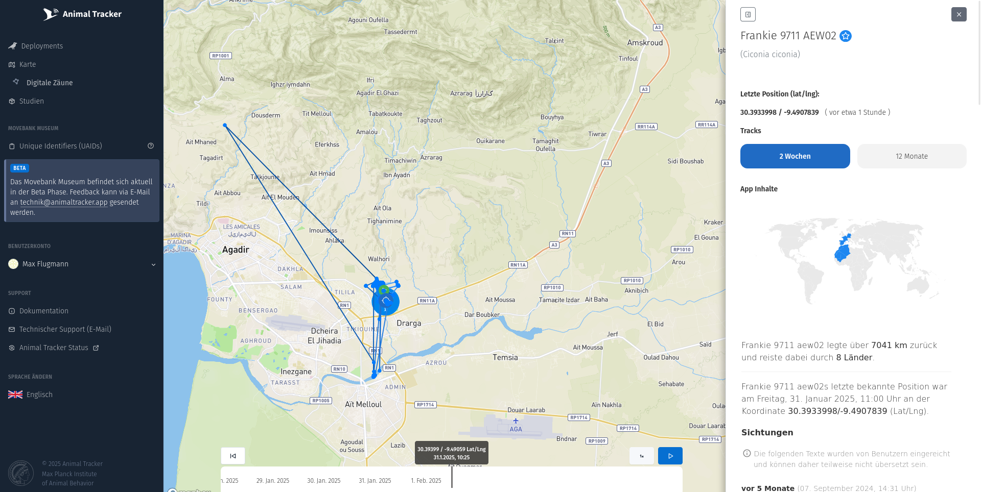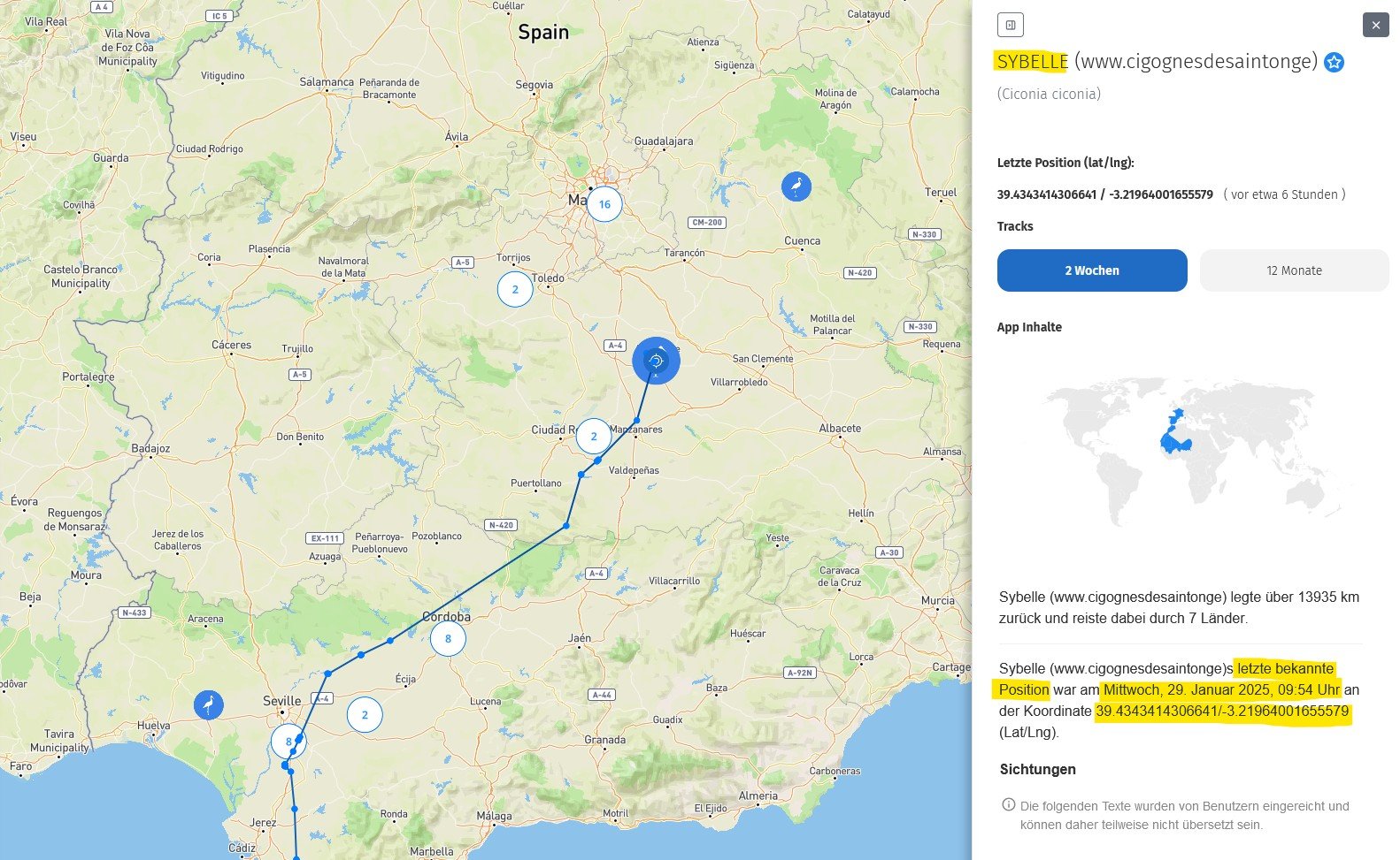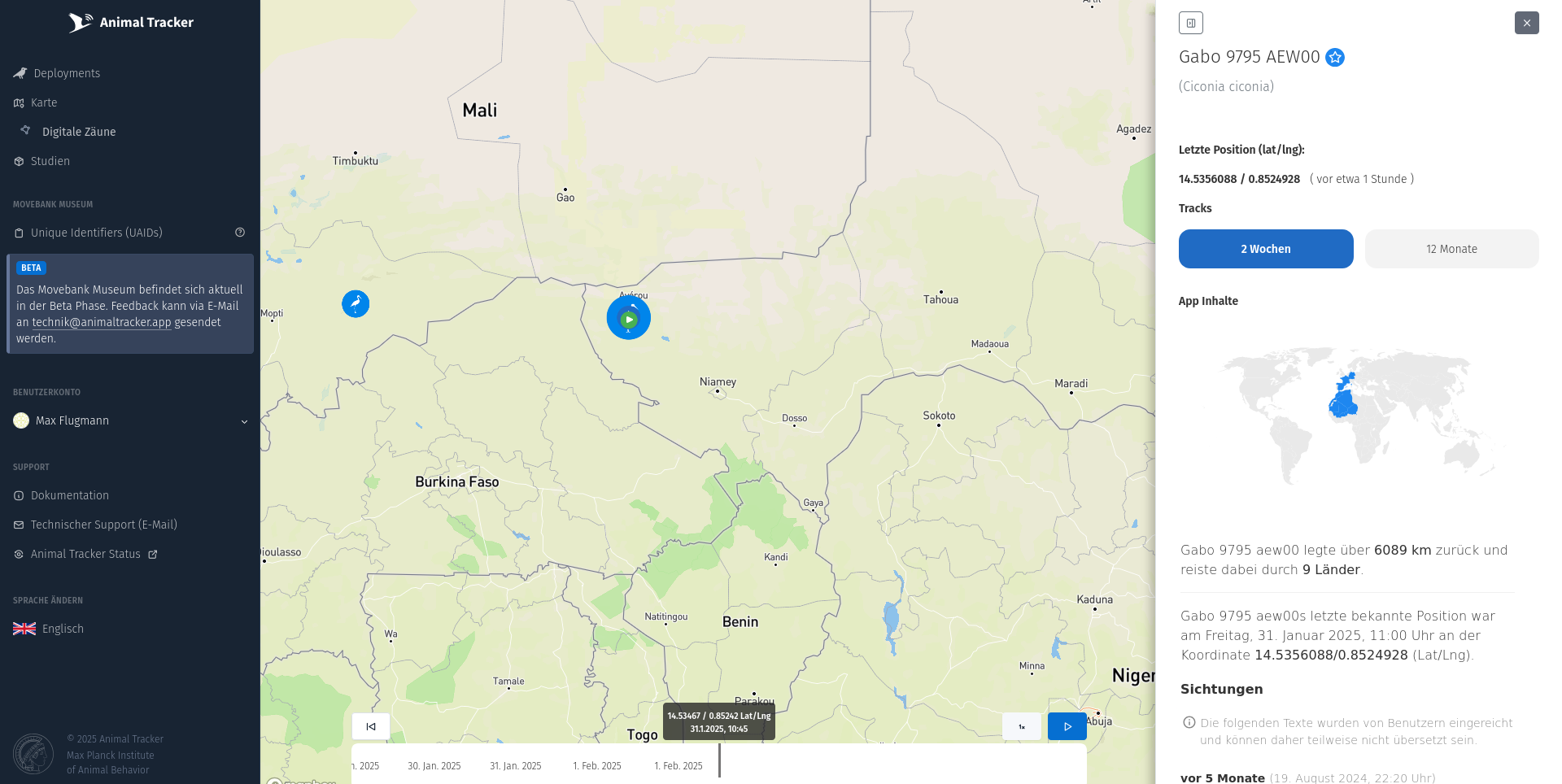 nach 2,5 Monaten Funkstille, in Mali geortet. Am 14. Nov. 2024 hatte ihr Sender zuletzt aus Burkina Faso gesendet.