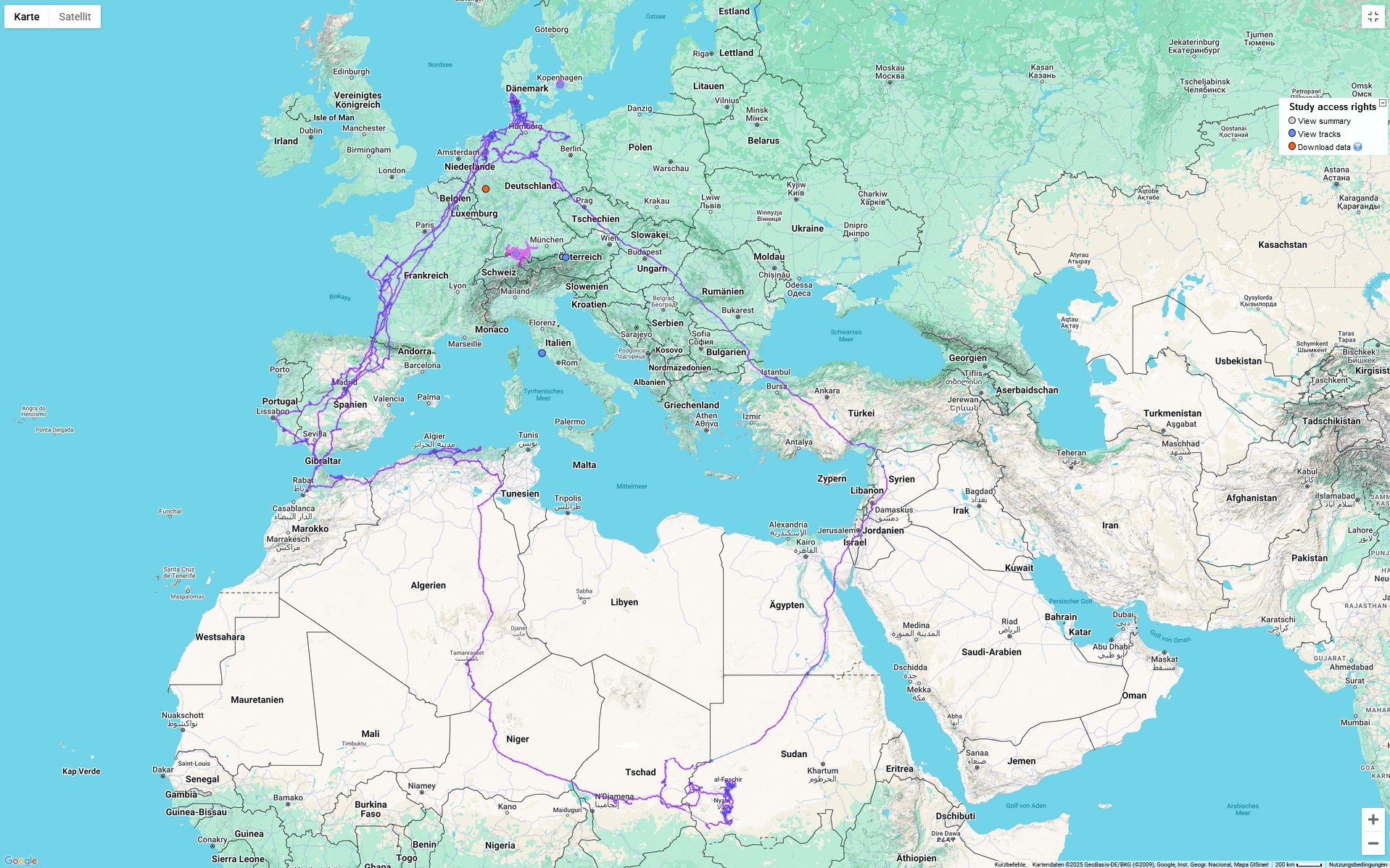 Ja, einmal direkt ans östliche Mittelmeer, über den Bosporus, dann nach Afrika bis in den Tschad, um dann weiter nach Westen zu fliegen, teilweise über und um die Sahara herum, über den Niger, Algerien, um dann wieder in Marokko herauszukommen, wo er dann die Gibraltar-Meerenge überquerte und über Spanien und Frankreich zurück nach Deutschland kam. Sagenhaft! :lol: