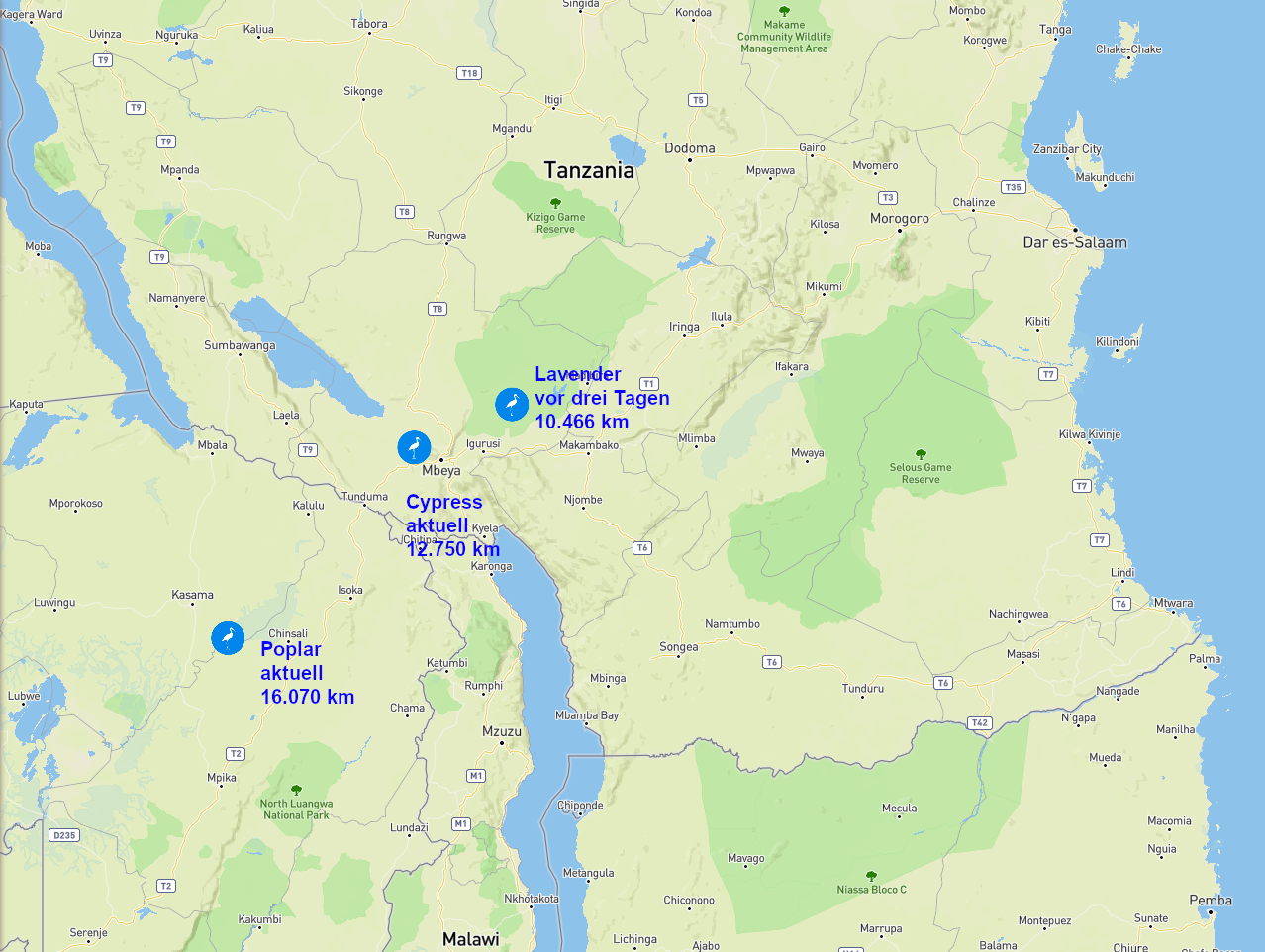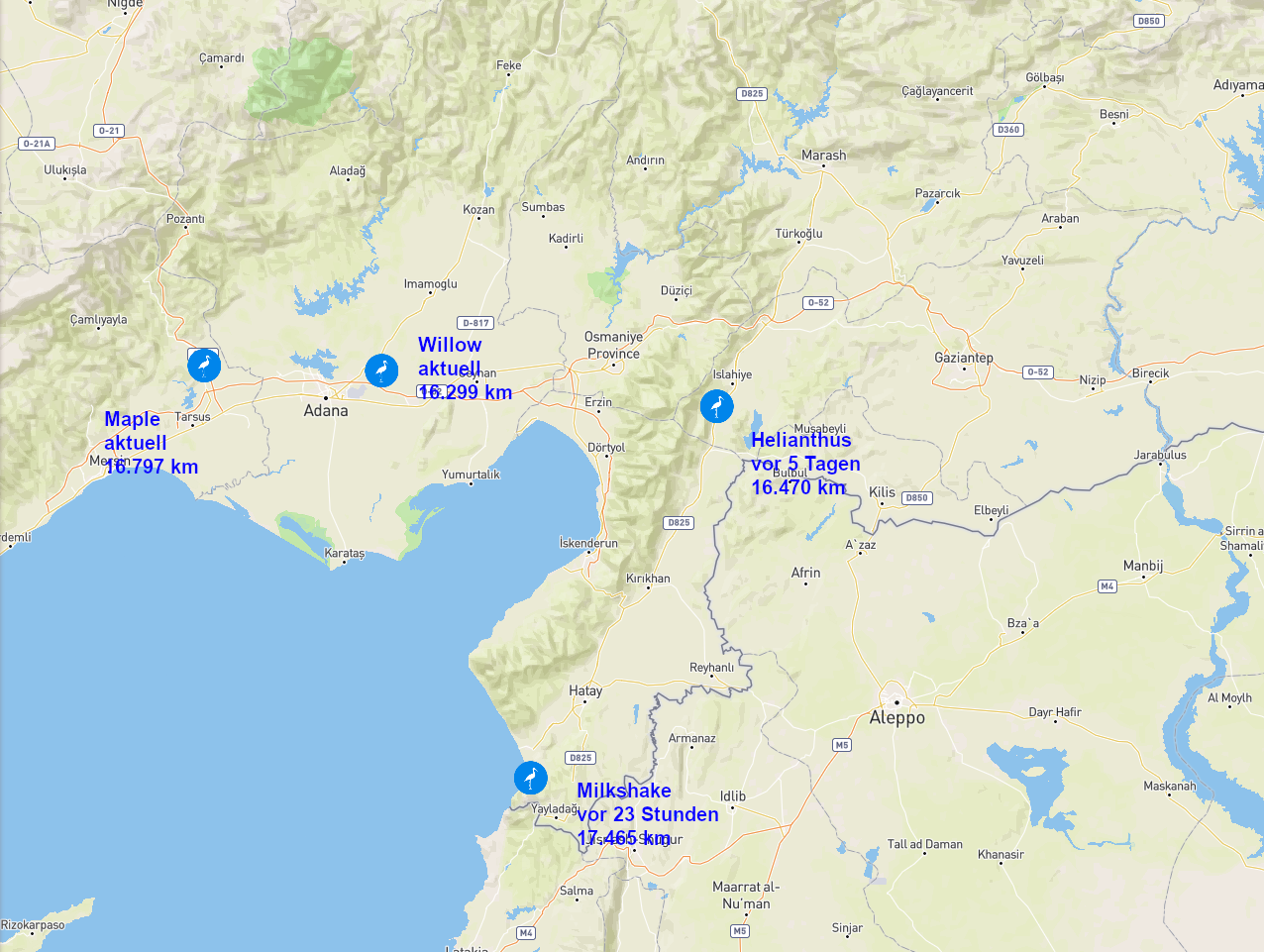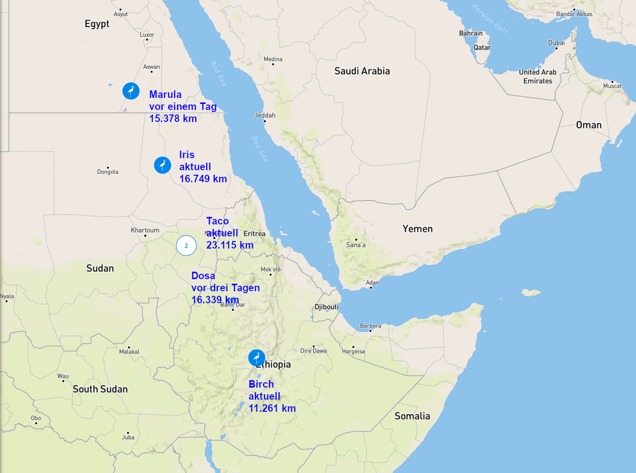sind weiter Richtung Norden geflogen. Leider hat Silene seit 10 Tagen nicht gesendet, ebenso ,Nabyszek ,aber auch hier kommt dies ja öfter vor in der Gegend. Ich hoffe, ich muss mir daher auch keine Sorgen um Dosa und Marula machen, die zwar senden, aber deren Bewegungen mir nicht gefallen. Bei den Franzosen Marleau, Sybelle und Charlie denke ich, ist alles gut.