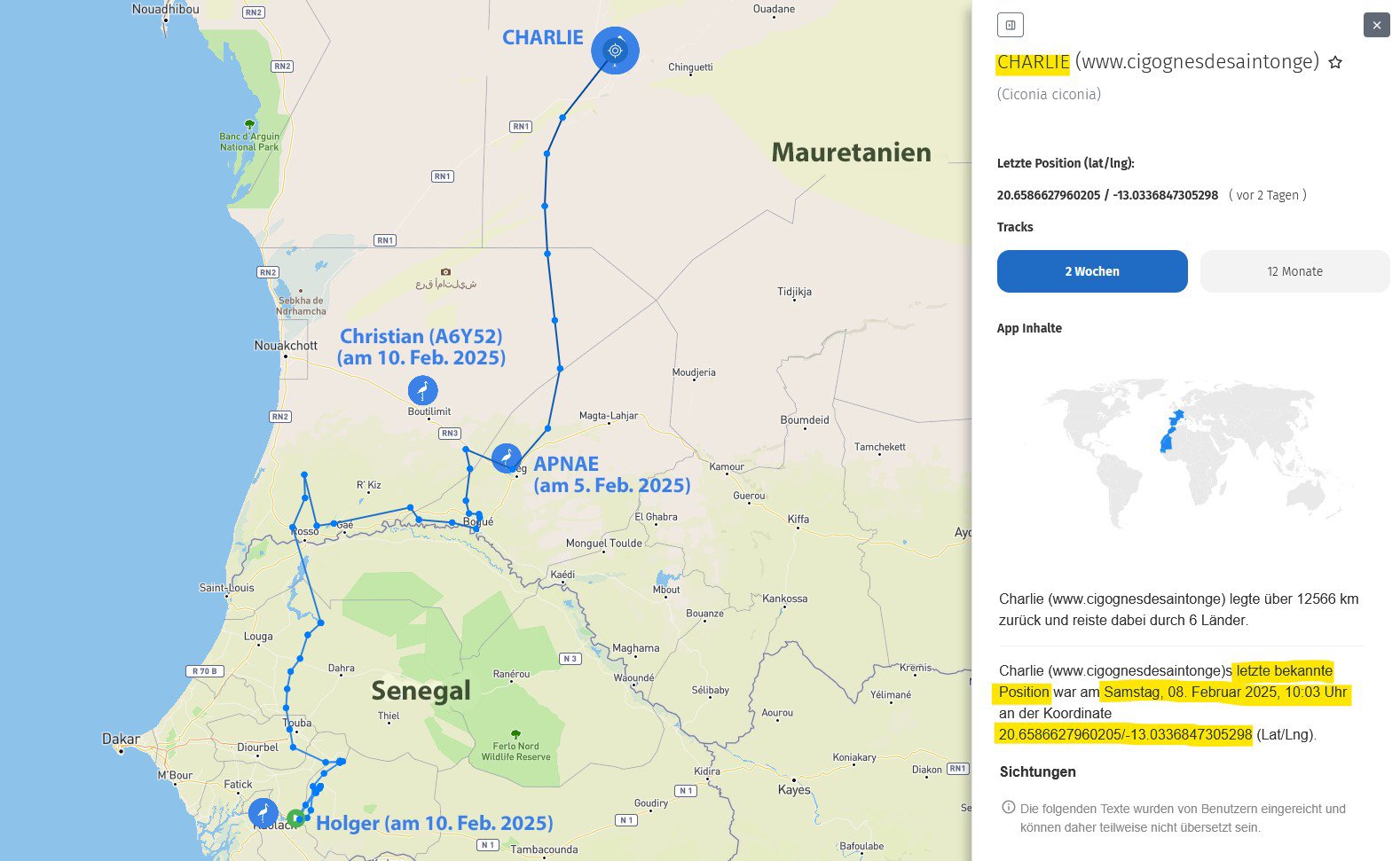 CHARLIE ist bereits weit im Landesinneren von Mauretanien. Er ist vermutlich aktuell in der Sahara unterwegs. <br />Das gilt vermutlich auch für die Störchin APNAE, die zuletzt am 5. Feb. 2025 geortet wurde.
