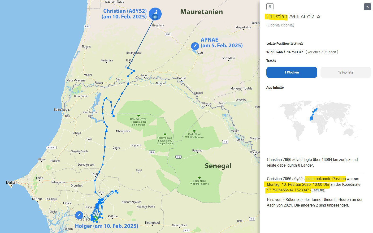 Christian ist am 6. Feb. 2025 aus dem Gebiet von Kaolack aufgebrochen.<br />Er flog eine etwas direktere Route als CHARLIE und APNAE und hat die Grenze zu Mauretanien vorgestern (am 8. Feb. 2025) überquert.