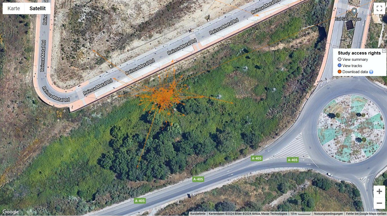 In der Movebank sieht man die verschiedenen Koordinaten der letzten 4 Tage sehr gut (orange):